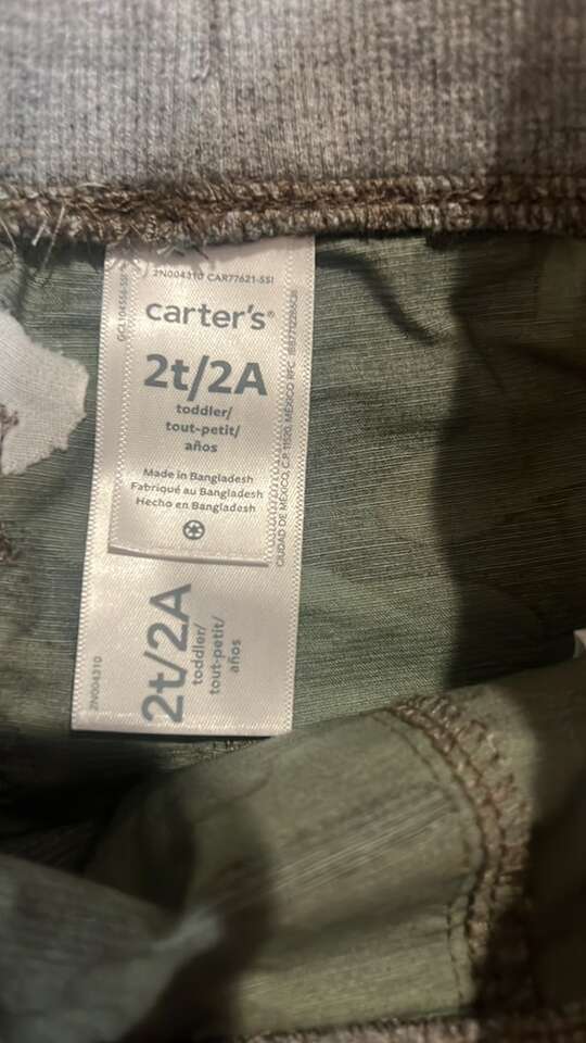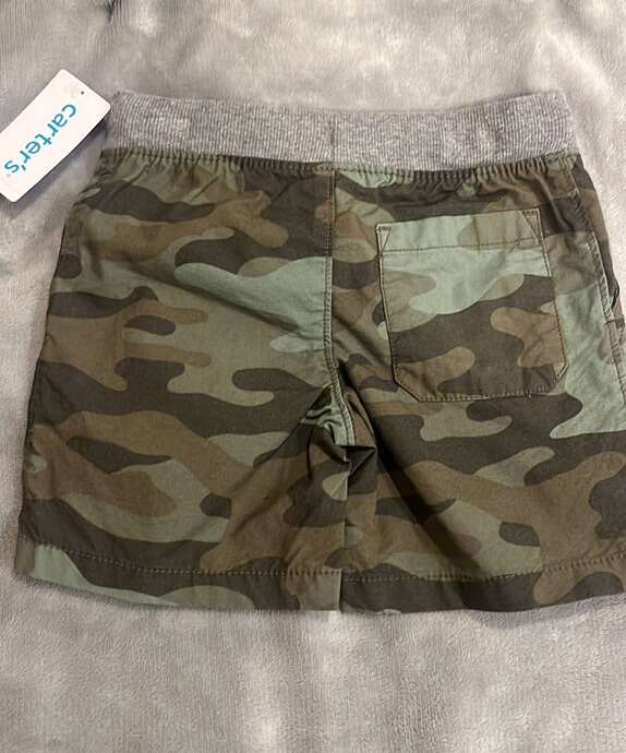 Brand new with tags Size 2T Carter’s brand Green camo with grey waist and blue drawstring Has hip pockets and a back pocket Cotton polyester blend. $5 Located by AF canyon Cash/Venmo