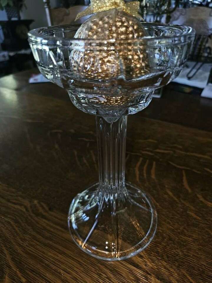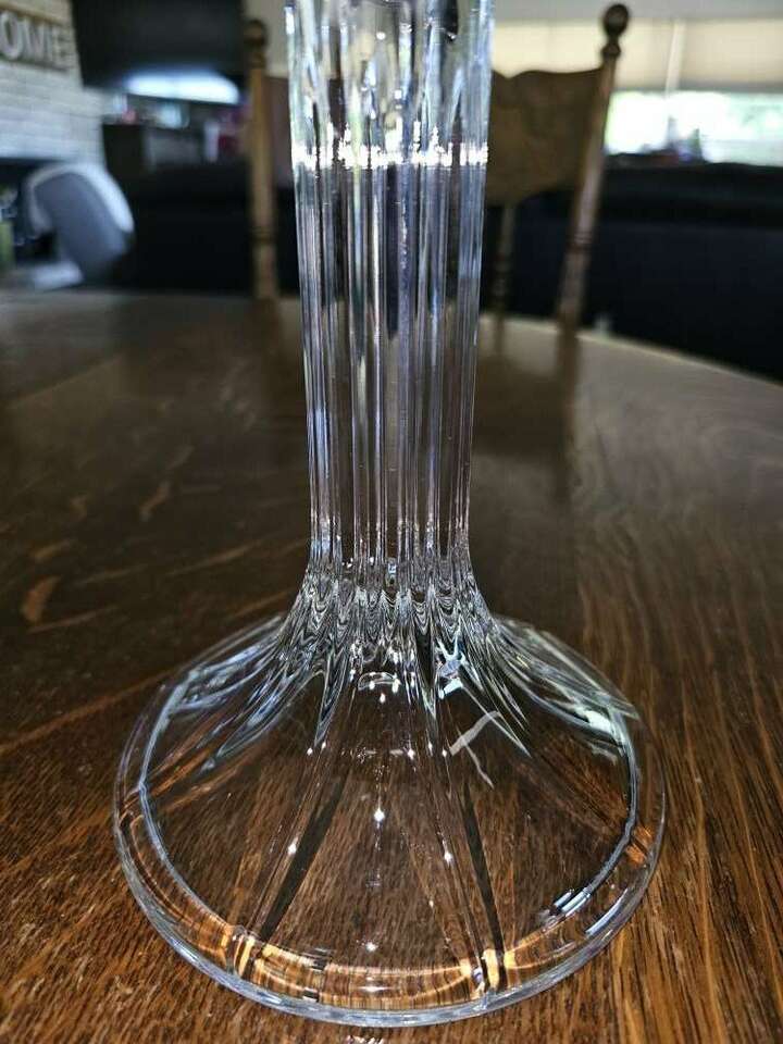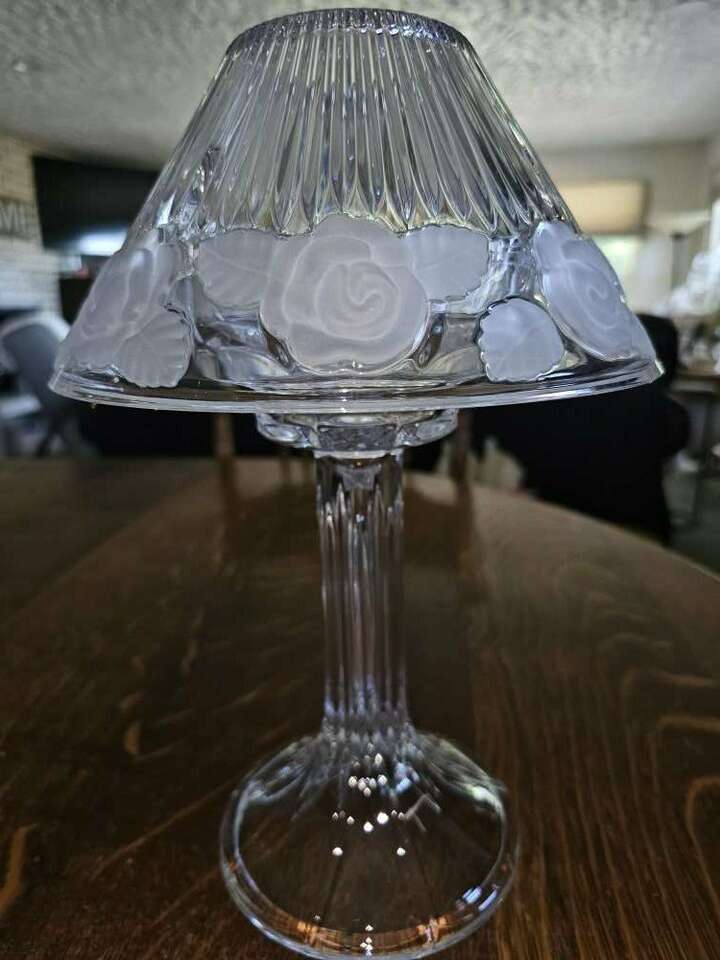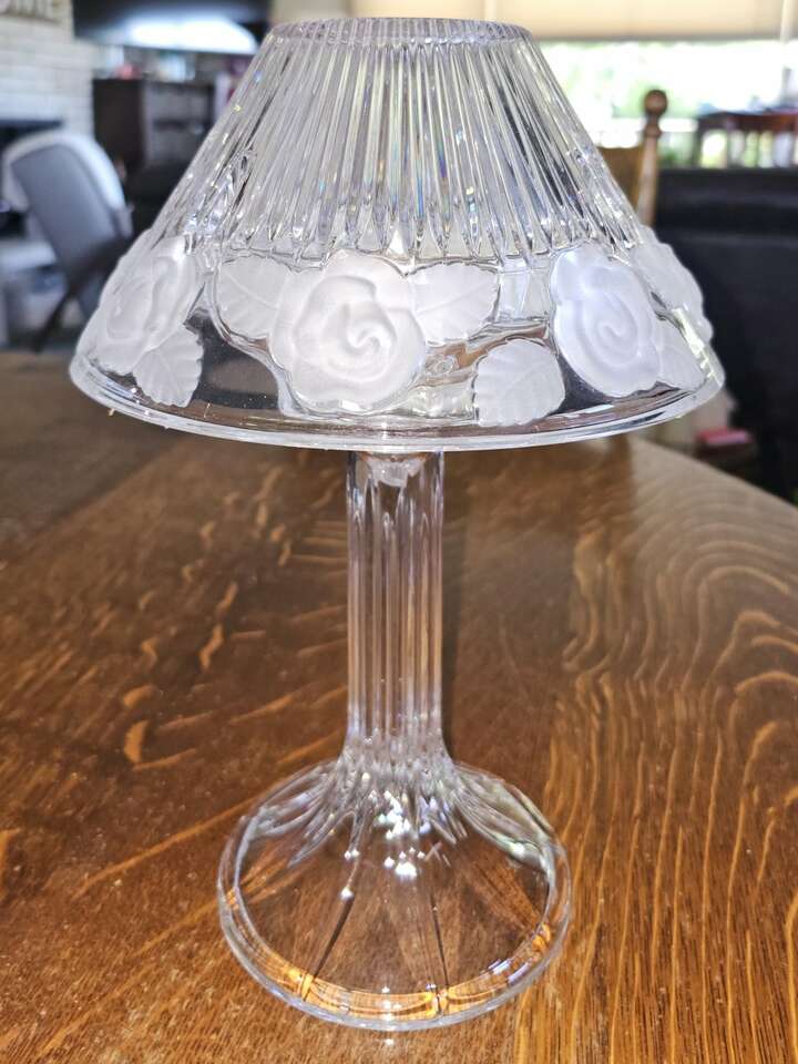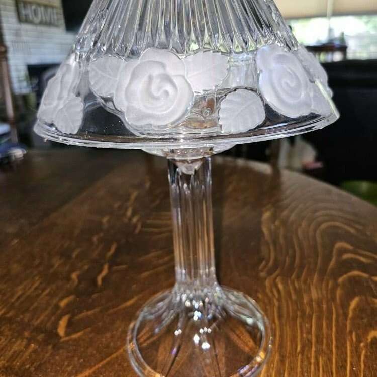 Pretty shimmering floral accented 2 piece Limited Royal 24% Full Lead Crystal - 12 1/2" high candle lamp. Looks just like an electrified crystal lamp!! and gives off a soft pretty glow or a very bright light depending on the size of candle used.