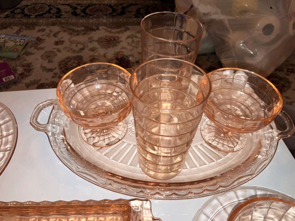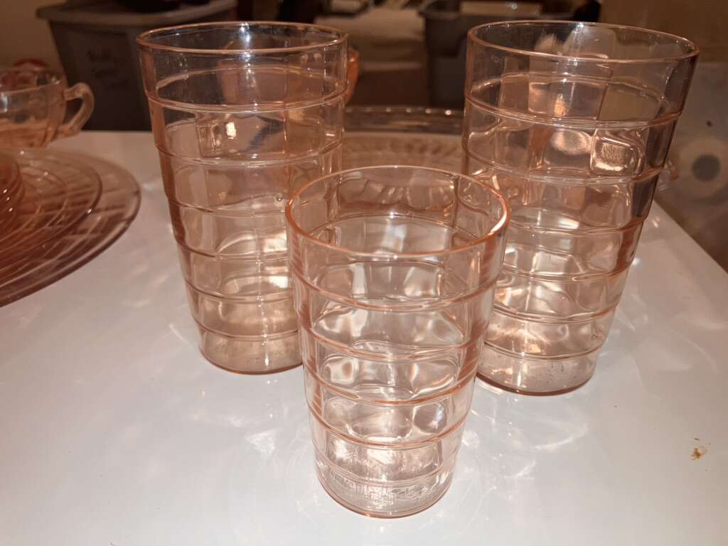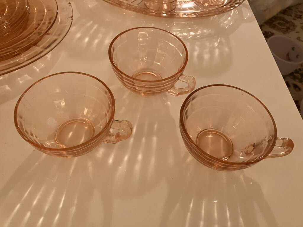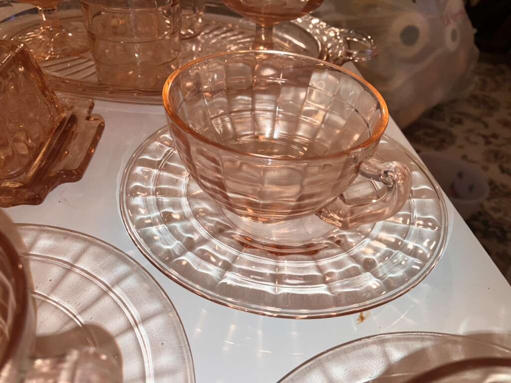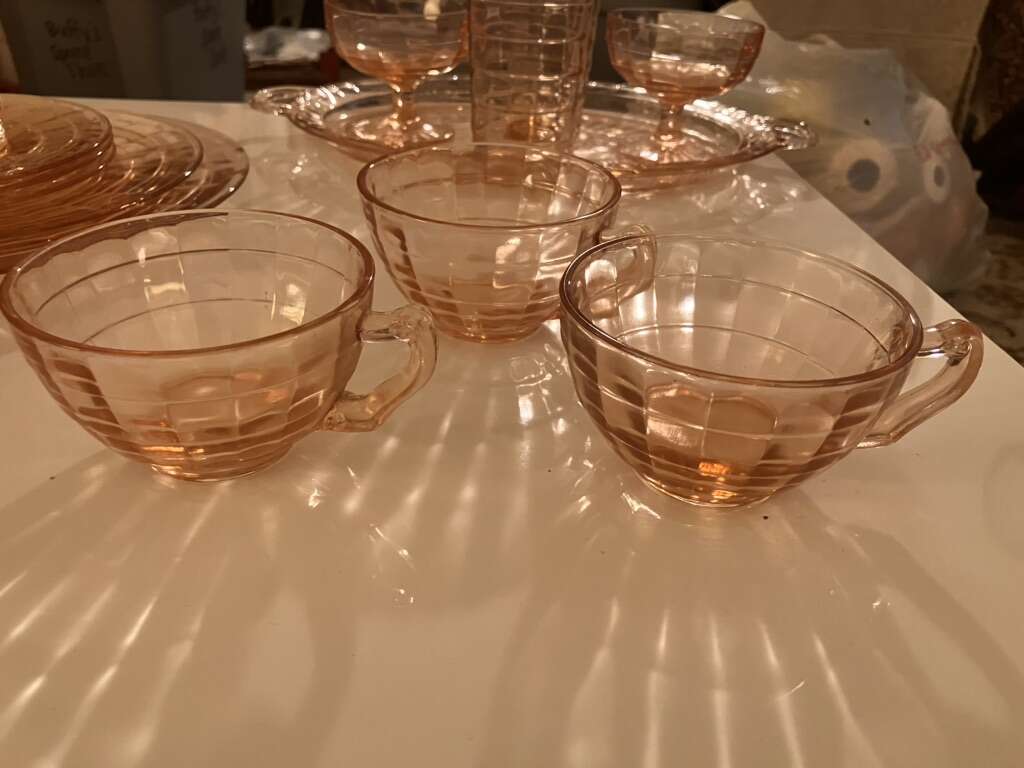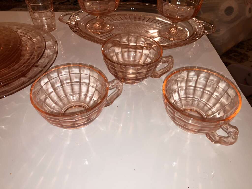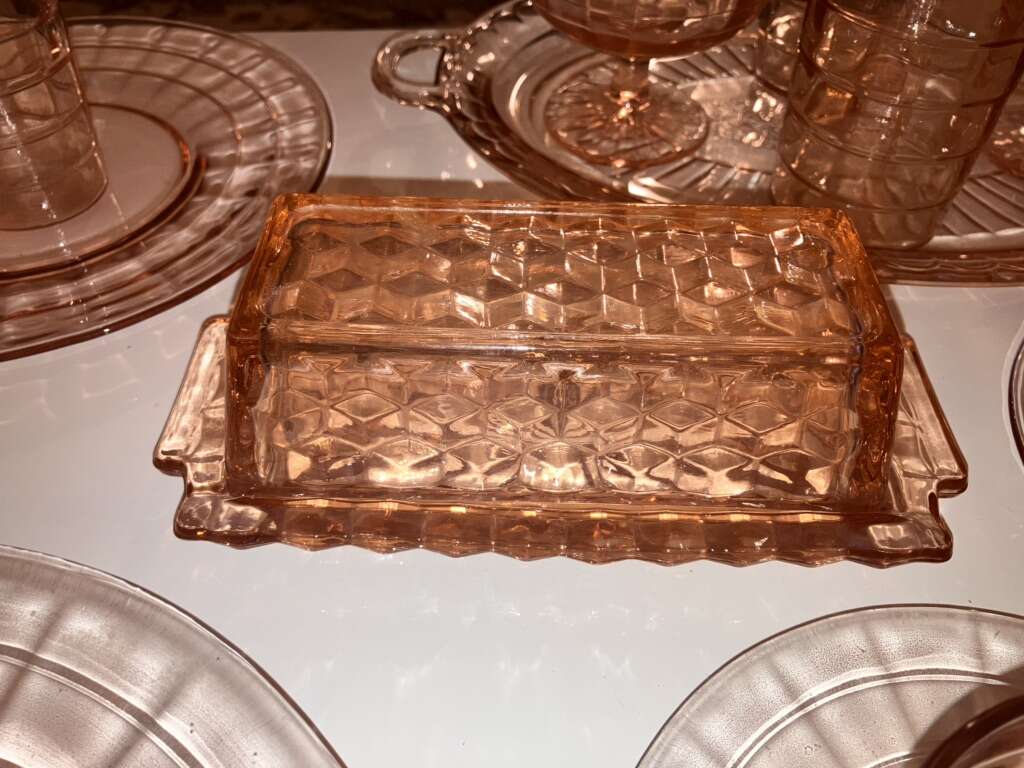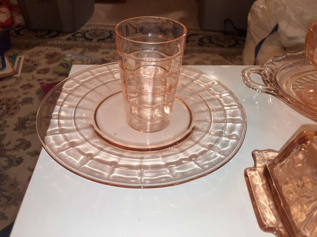 Vintage Pink Cubist Depression Glass, Plates, Cups, Tumblers, Butter Dish, Sherbet &Cups 16 pieces various