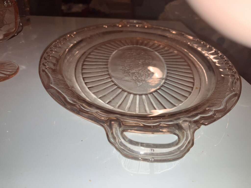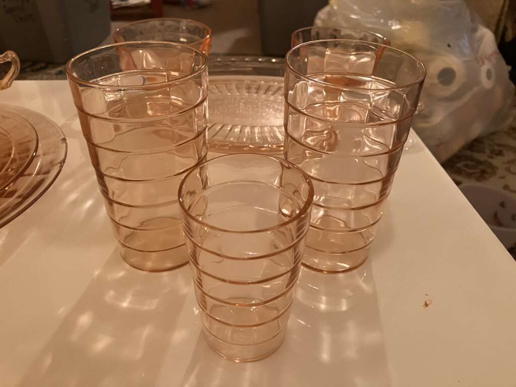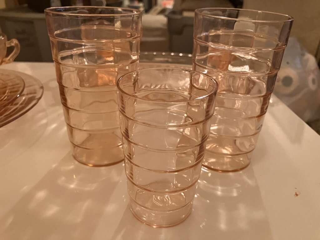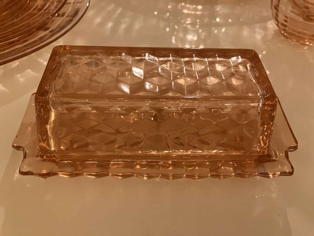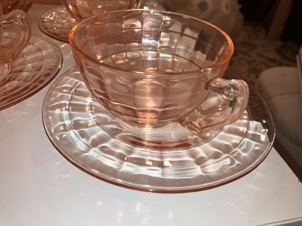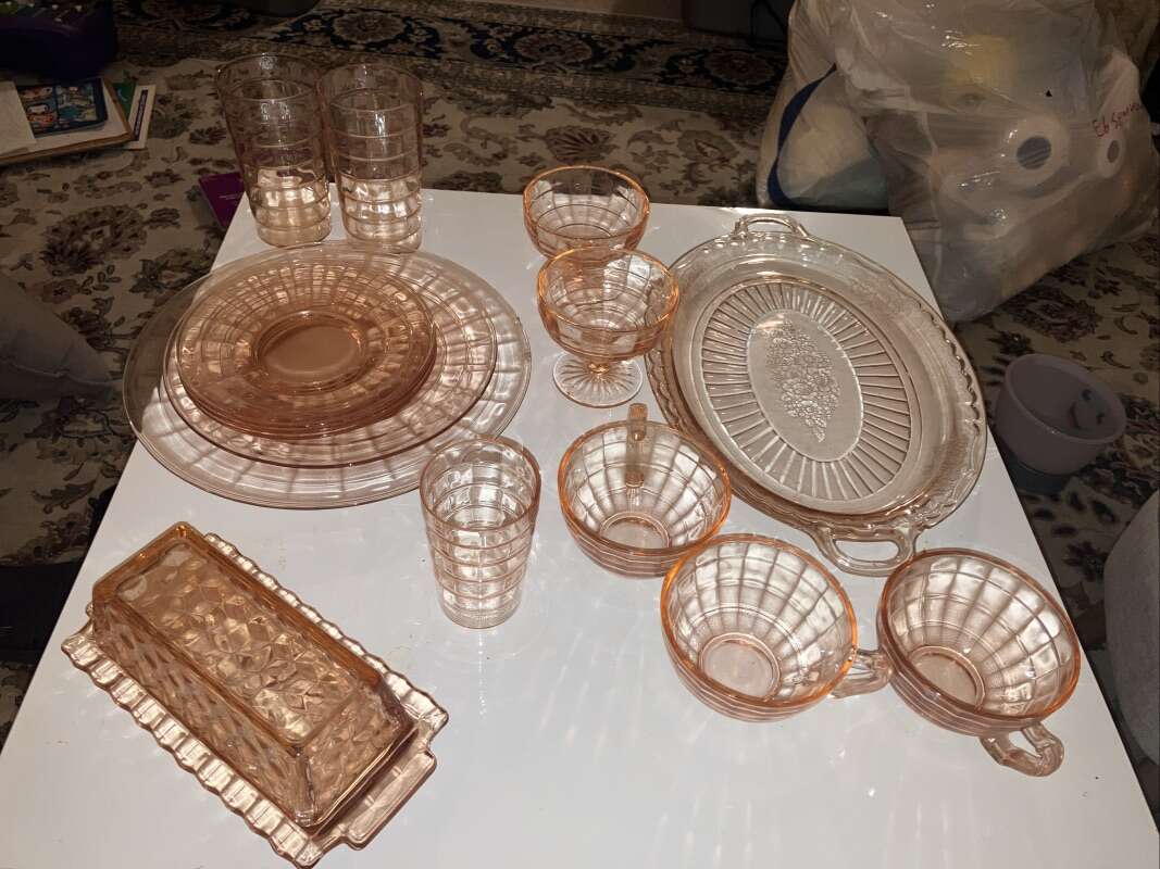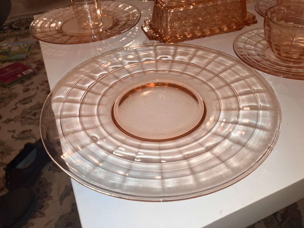 Vintage Pink Cubist Depression Glass, Plates, Cups, Tumblers, Butter Dish, Sherbet &Cups 16 pieces various