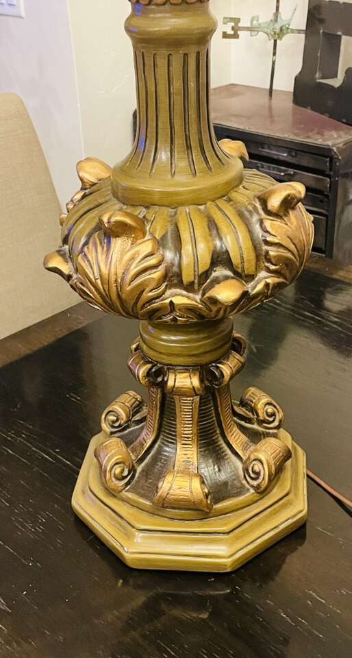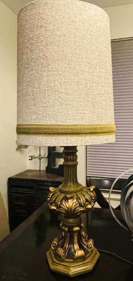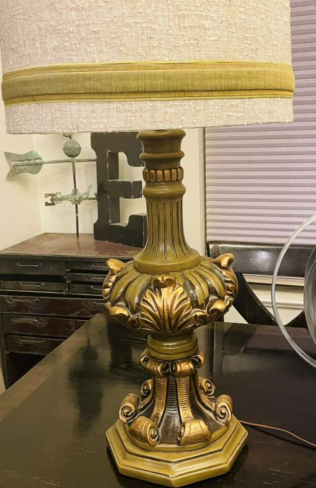 Incredible lamp in perfect working condition with matching vintage shade. Lamp/shade together stand 46” tall, a true statement piece.
