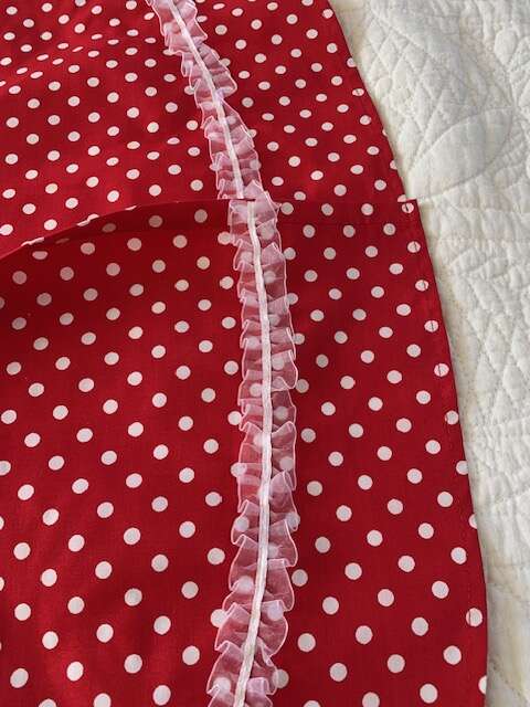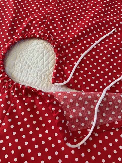 This listing is for a Christmas tree skirt made of high end 65% polyester/35% cotton fabric with a sturdy, tight weave, medium weight. Skirts come in both a red/white and black/white polka dotted print trimmed in white ruffled nylon organza topped with satin polyester ribbon. The black version is not pictured, but it is identical to the red, but in black. A drawstring keeps skirt in place on various sized trees, plus the circle is generously cut to allow about a 4” overlap. Three sizes available:
