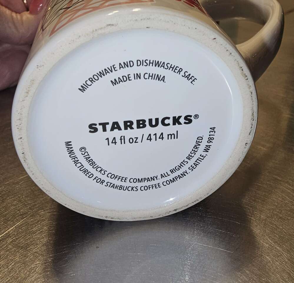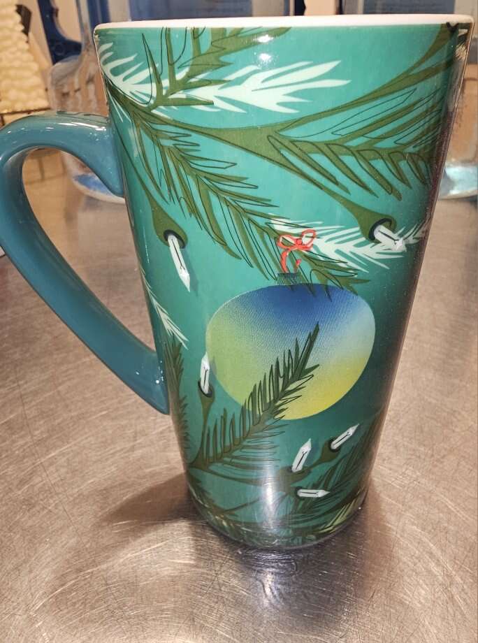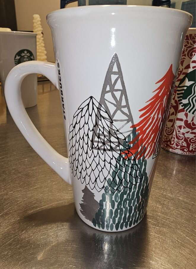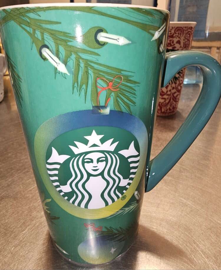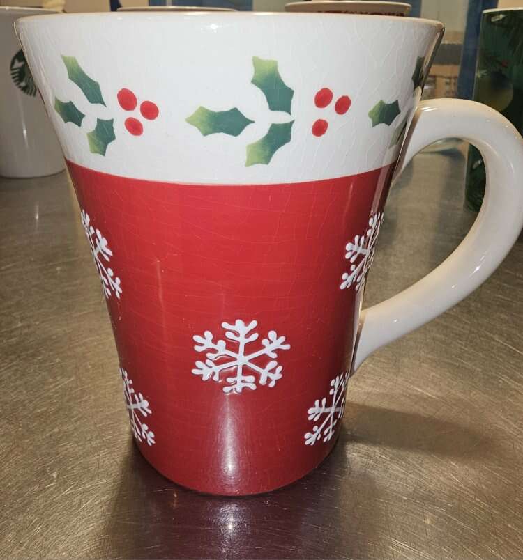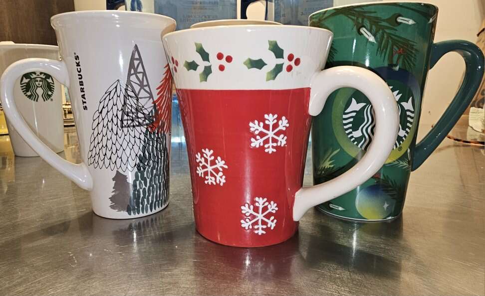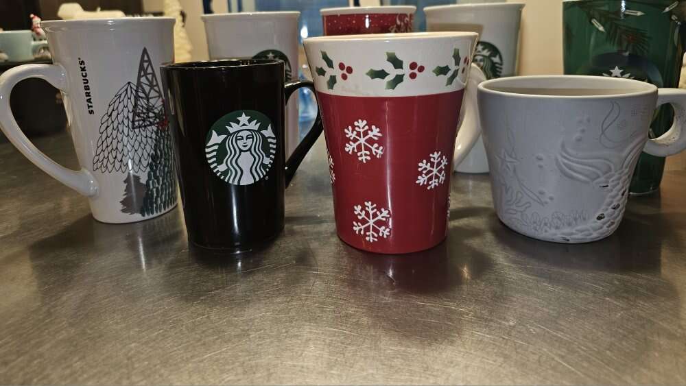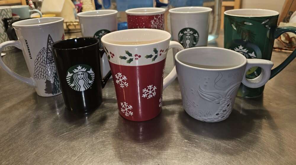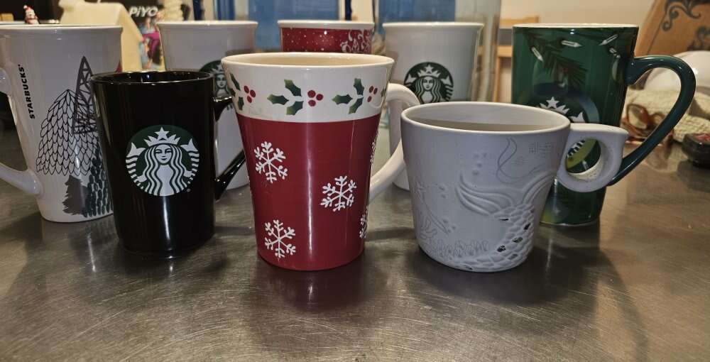 Group of 8 pretty Starbucks Mugs. Different sizes, different shapes and 4 with handles, 4 without. Four are Christmas themed.