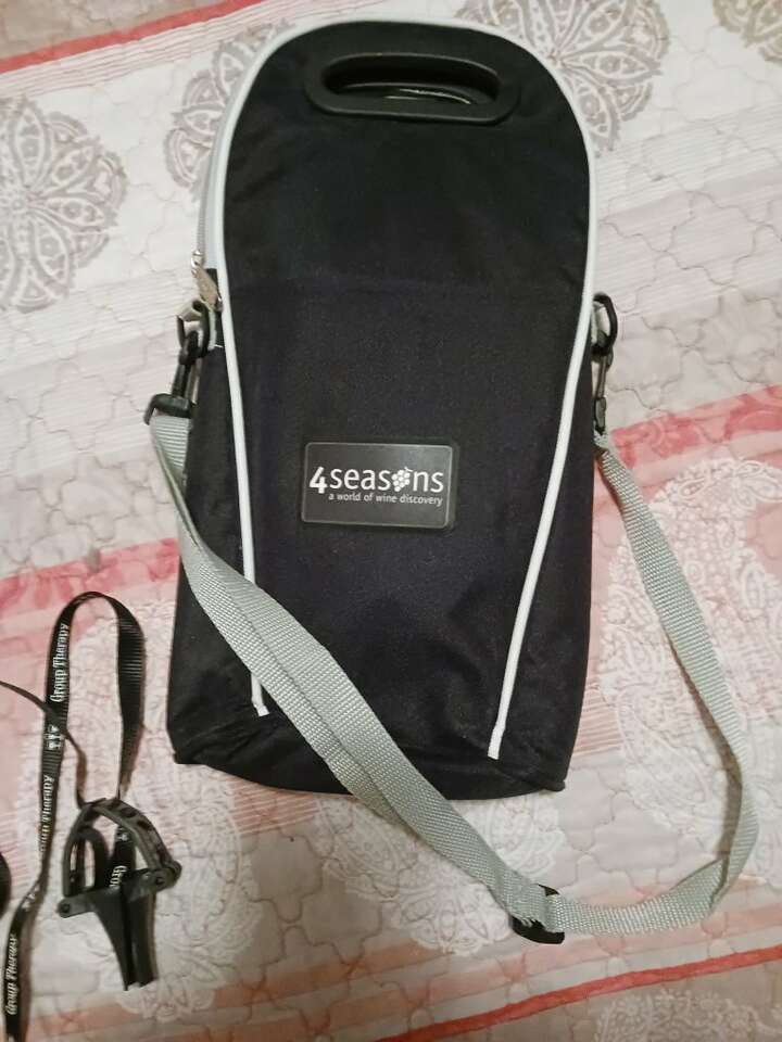 4 Seasons brand, Soft sided holds two 750 L bottles. Storage pockets on both outer sides. Use attached handle or detachable shoulder straps. Comes with novelty lanyard that holds a wine glass with stem. Convenient for lots of fun.