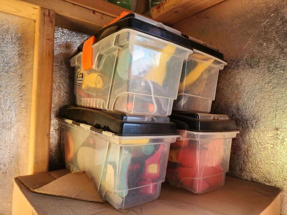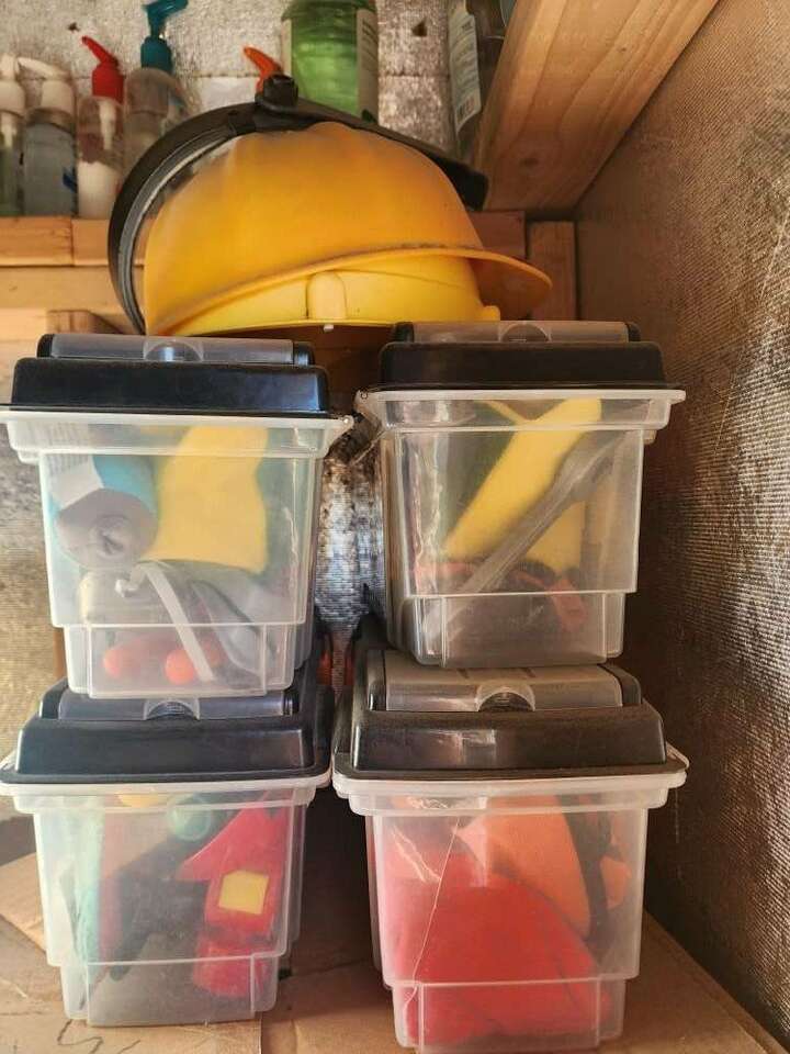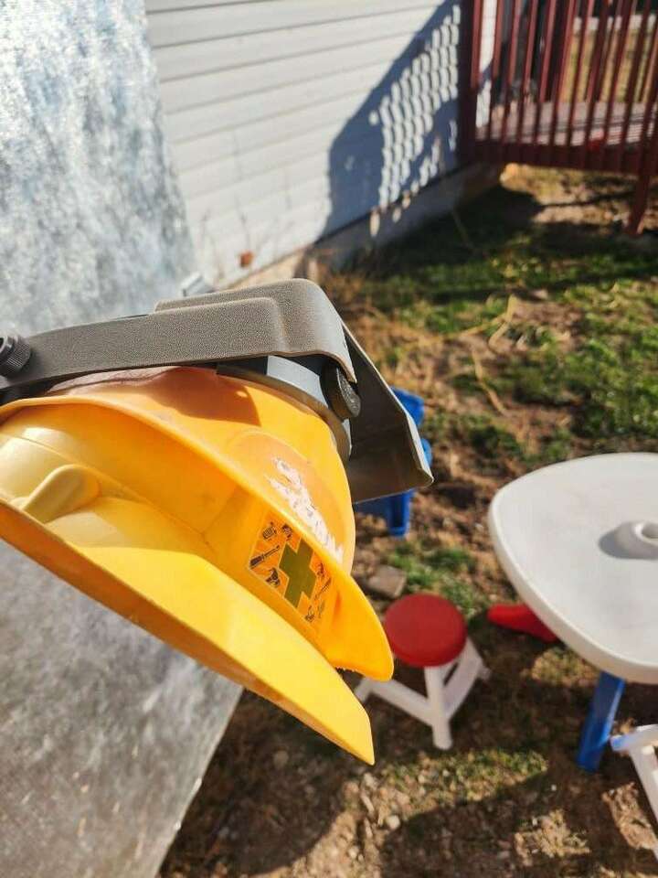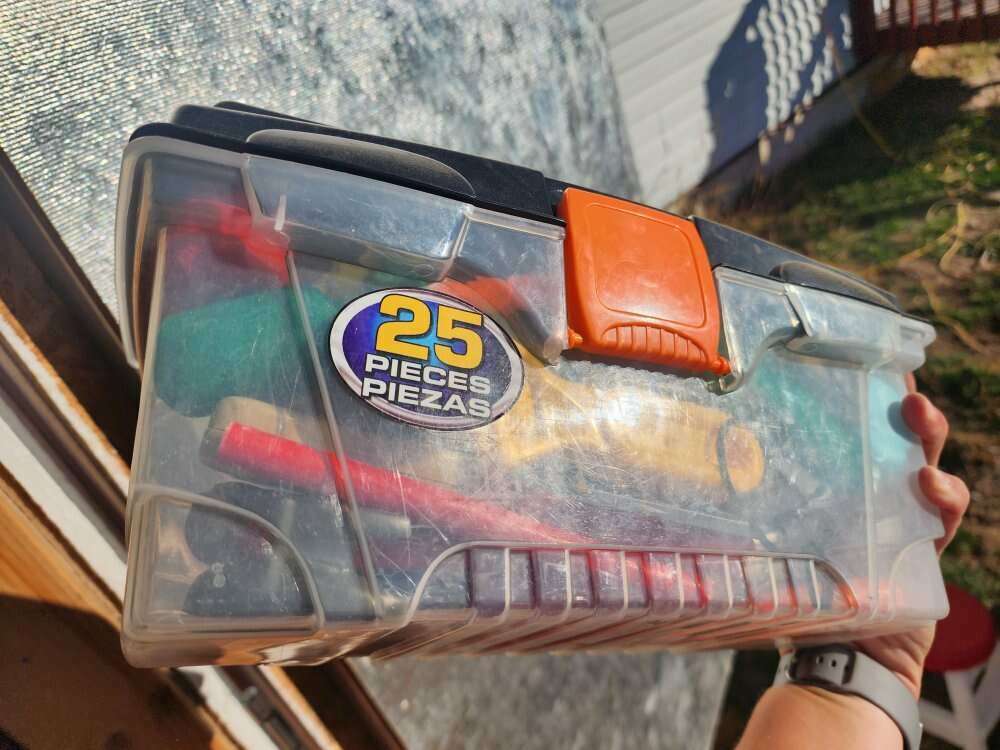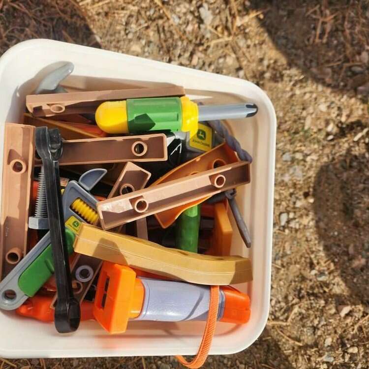Little tikes construction bench and tools. A few of the tool boxes have cracks in them. Tote full of nails, hammers, wood pieces, screws etc. All the tools you could need and two hard had and visor. Little tikes construction bench fold out support broken at the top. It's still functional, just not attached. $65 obo