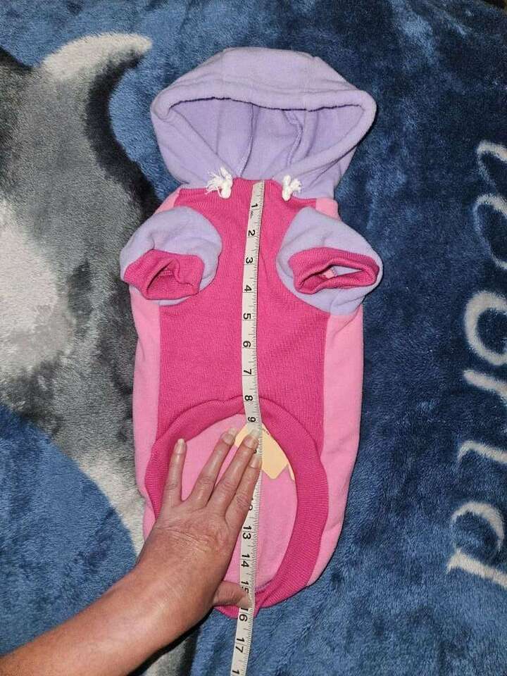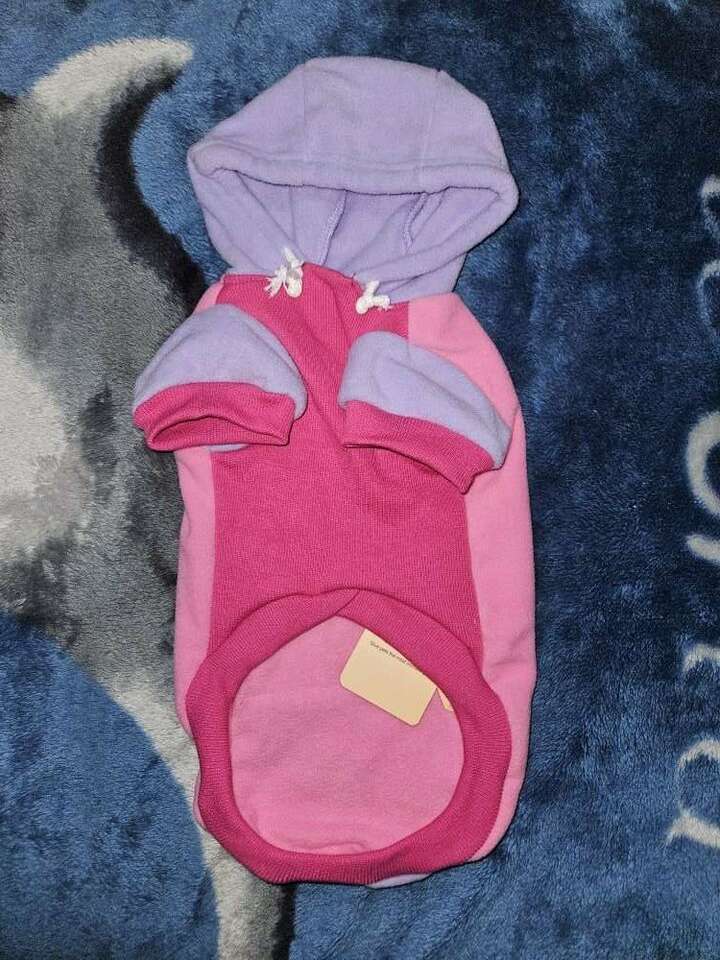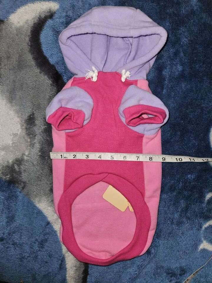 This sweater is new never used. It's a size small medium, and 100% Polyester. There is the opening on the back for a leash. Please check the measurements in the pictures to make sure this will fit your little one. All my items come from a smoke free home. Any questions please feel free to contact me. I am willing to mail packages as long as your ok with the shipping fees :)