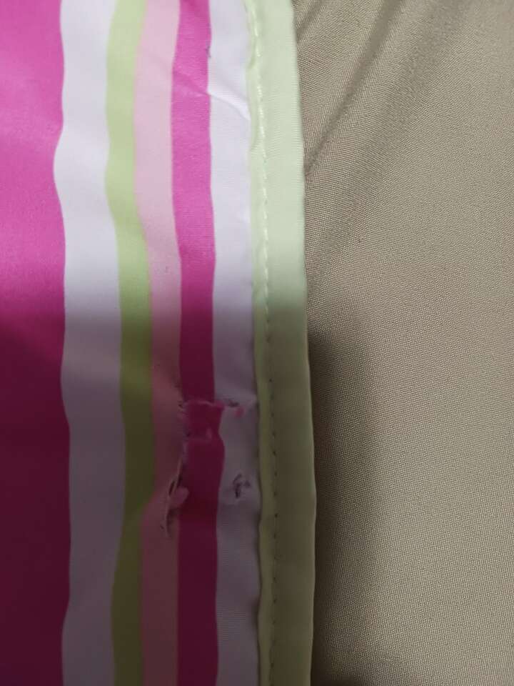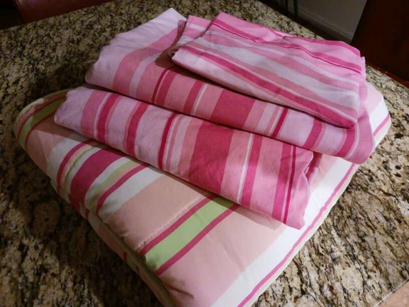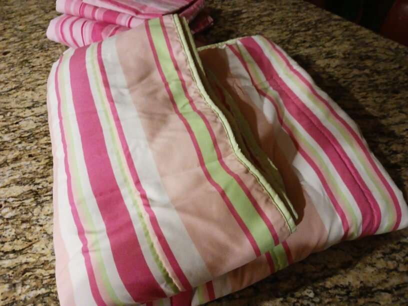 Pink, white and lime green double sided small comforter type 54 × 46 inch blanket. Lime green piping around outer edge. Sherpa type material on one side. Matching Pink and White striped twin fitted and top sheet and pillowcase new. Small 1" 3 cornered tear on blanket as shown in picture four. Not sure what it got caught on but easily repairable.