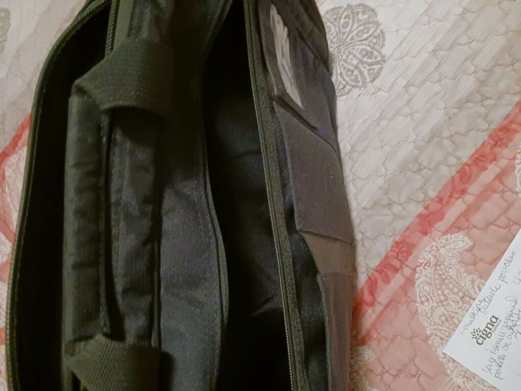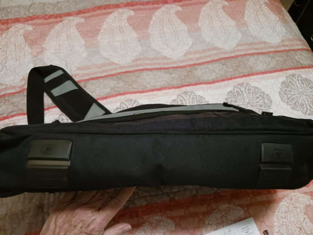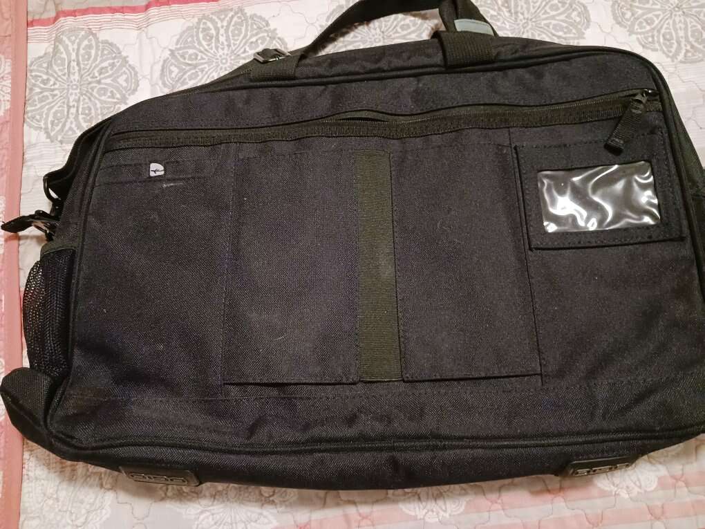 Dark black, looks light in pictures.18 X 14 X 3 inch OGIO Laptop multi storage bag. On outside multiple pouches rear compartment with file stash., also one small zippered and one large easy access zippered pouch with stash compartments. Inside padded laptop compartment and additional compartment with six organizers. Includes audio pocket, cell pocket and key clip. Hydration ready. Rubber feet on bottom. Handles plus detachable shoulder strap and strap for luggage trolley handles. Upwards of $99.00 new.