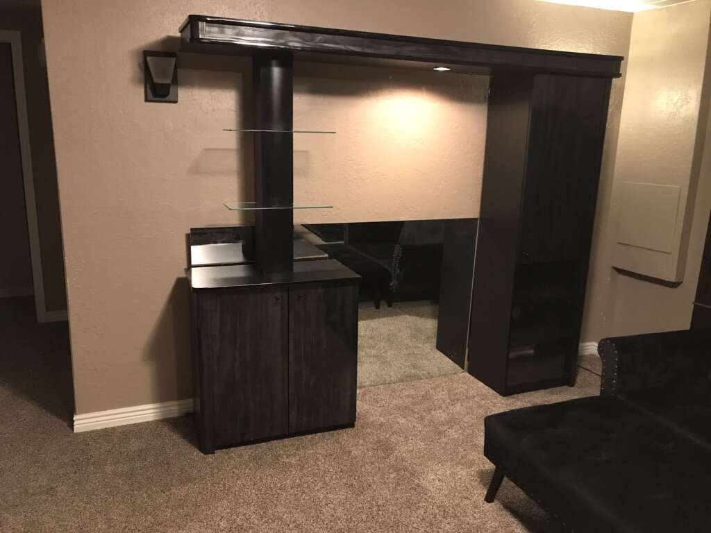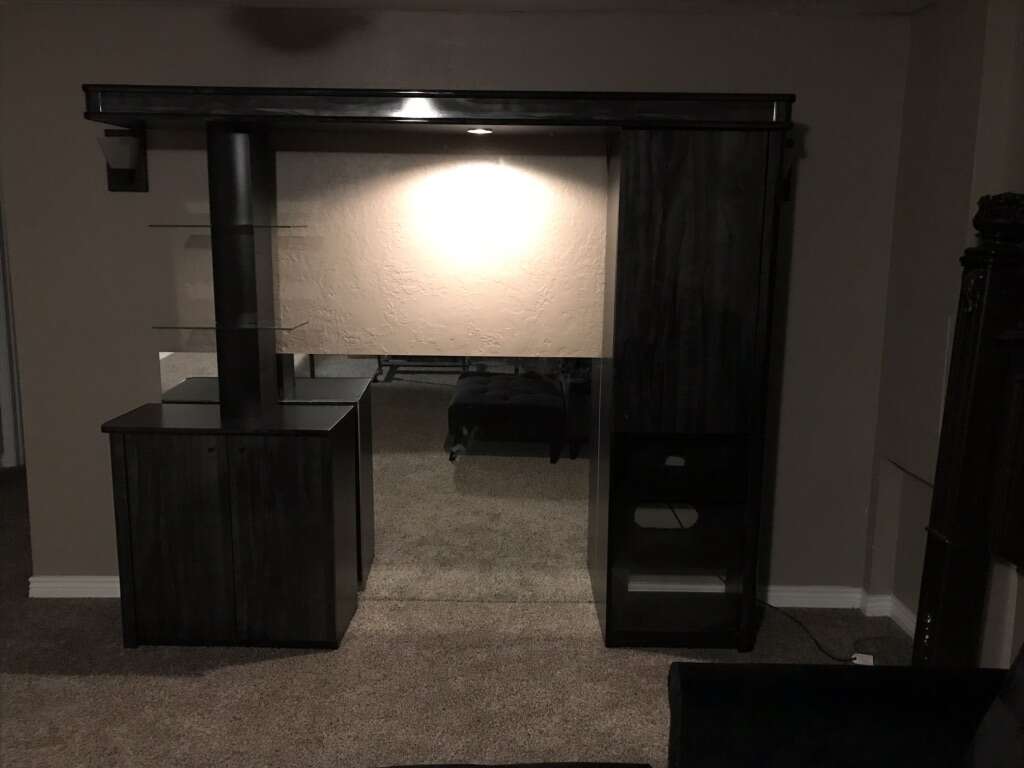 This entertainment center measures 89” long, 16” wide, 75” high. Can expand by several more inches, with lights and currio cabinets.