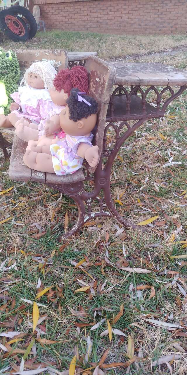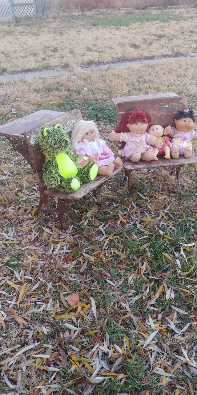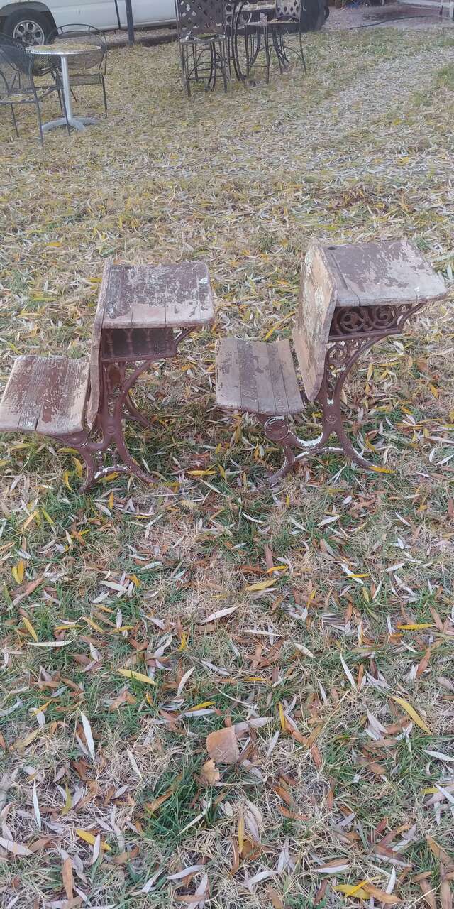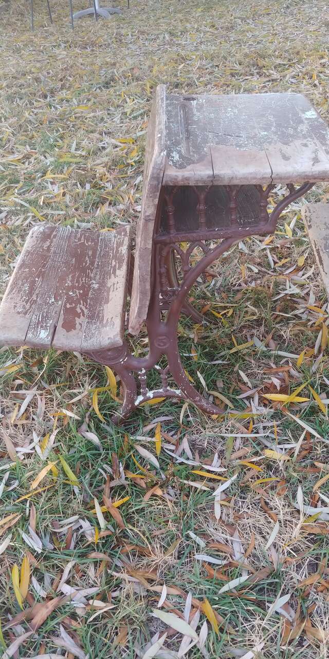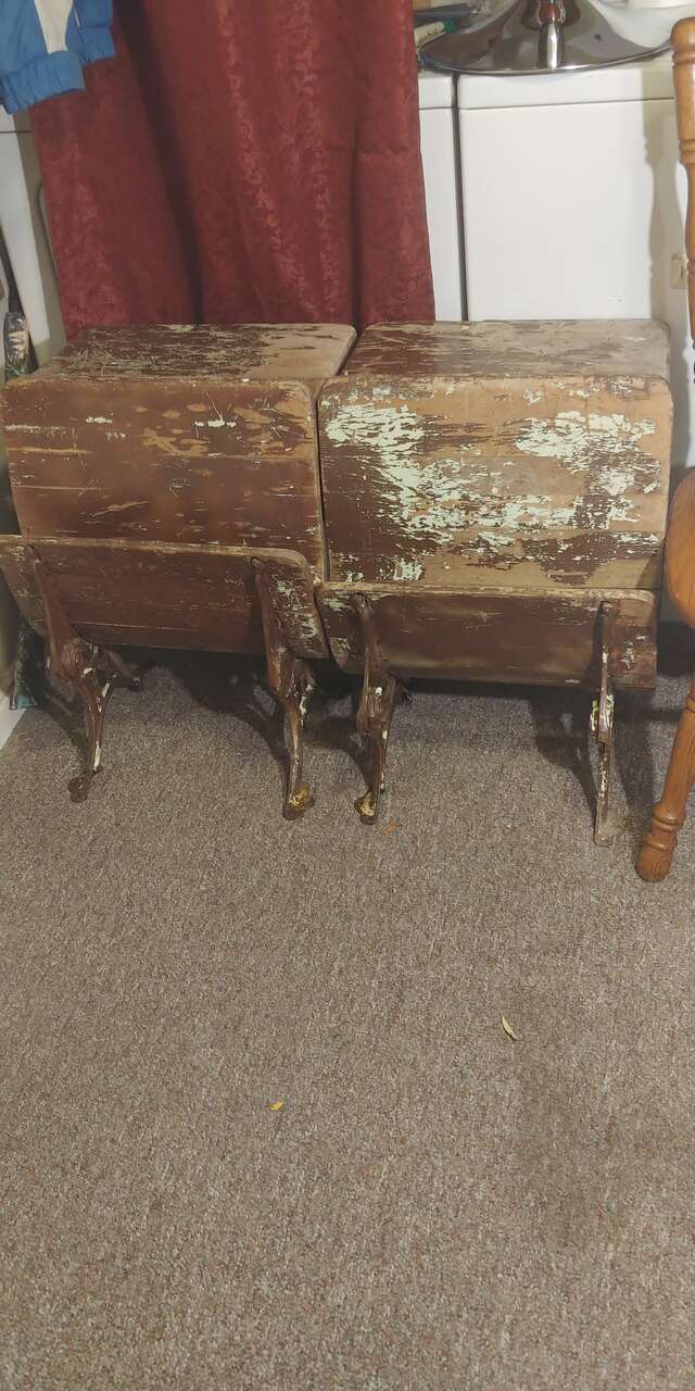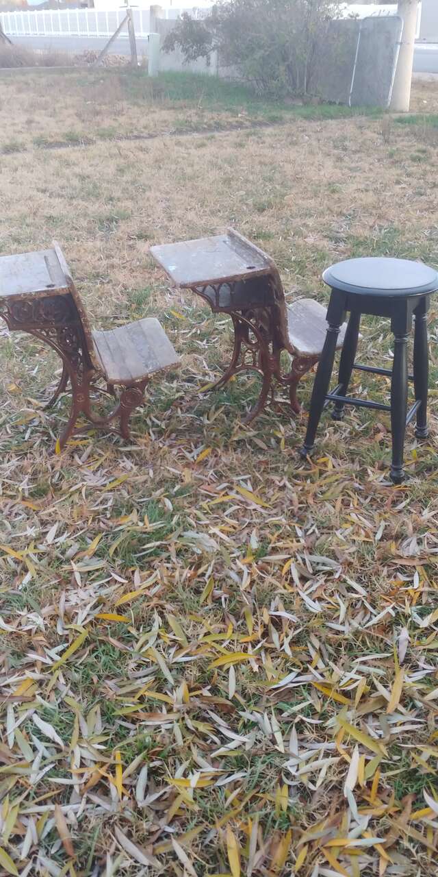VenmoKindergarten size. Set of 2. See pics. Patented 1881. Decades of patina, cool look. Solid and all working. Stool and dolls are to show size comparison. Size 18 Wide 26 long seat 12 hi desk 23. Sold as set $150.