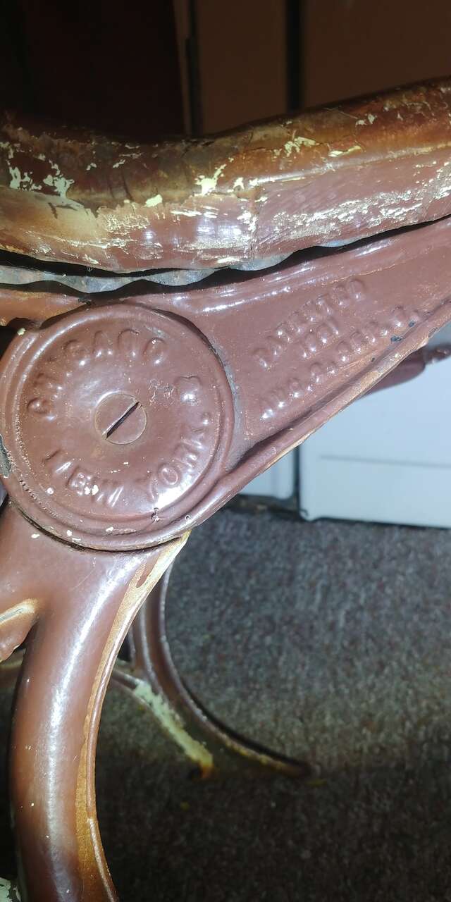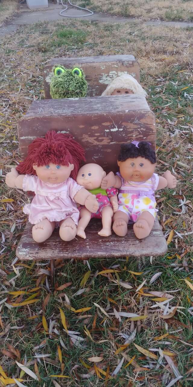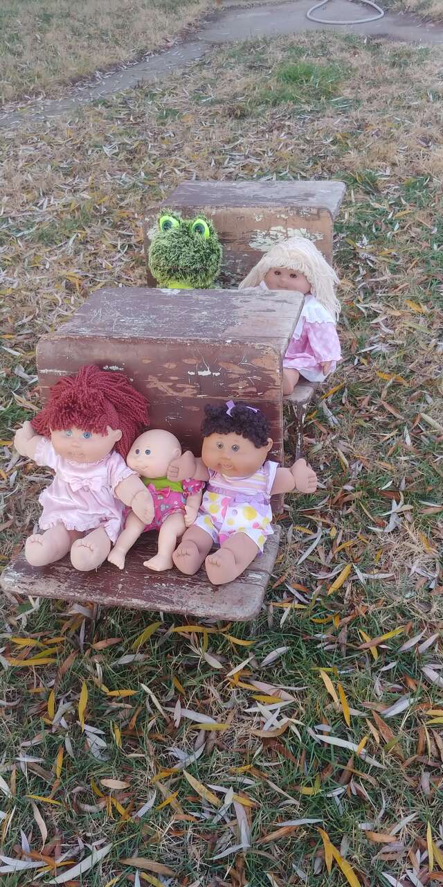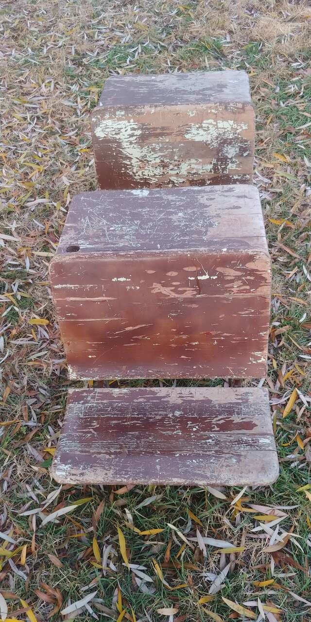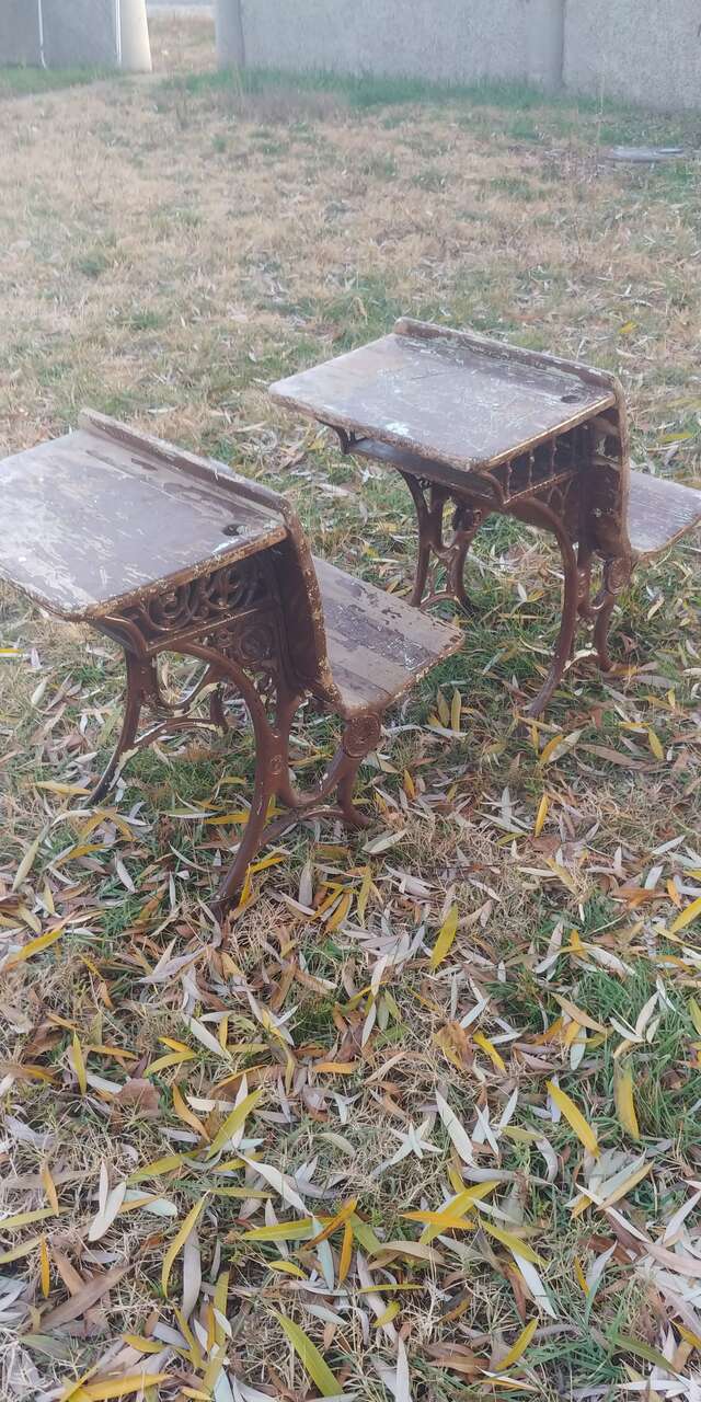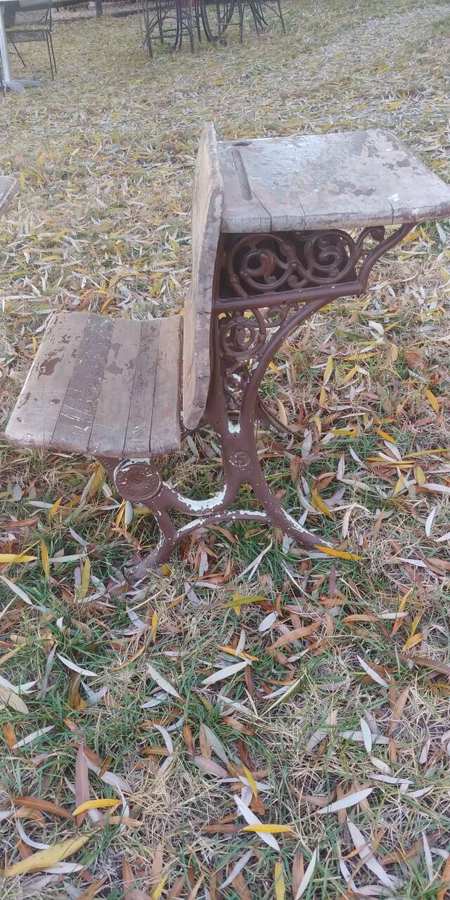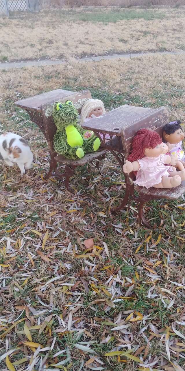 VenmoKindergarten size. See all pics. Decades of patina, cool look. Size 18w 25 long seat 12 high desk 23. Solid, functional or decor would be cute for a doll display. A.H. Andrews & Co. #5. Patented 1881. Sold as a set $150. Stool and dolls are to show size comparison.