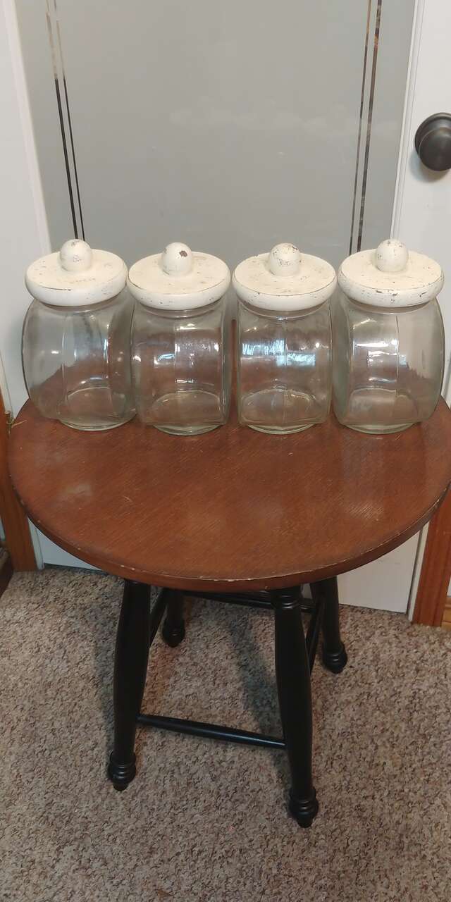 VenmoNice dispensers for display, candy, snacks, even dog treats. 4 glass canisters w/lids extra storage on the side. Size 20.75 wide 16 high 12 deep.
