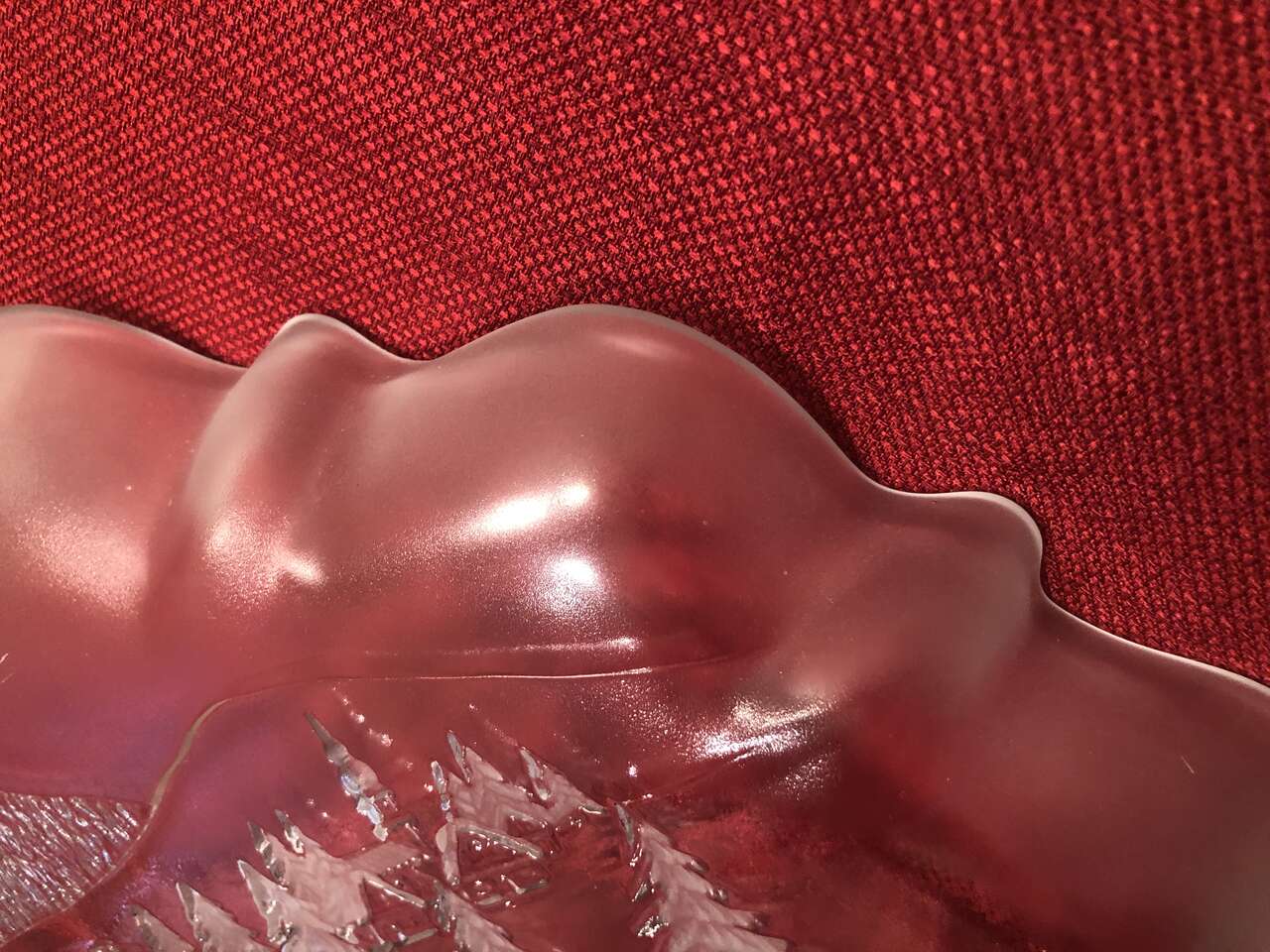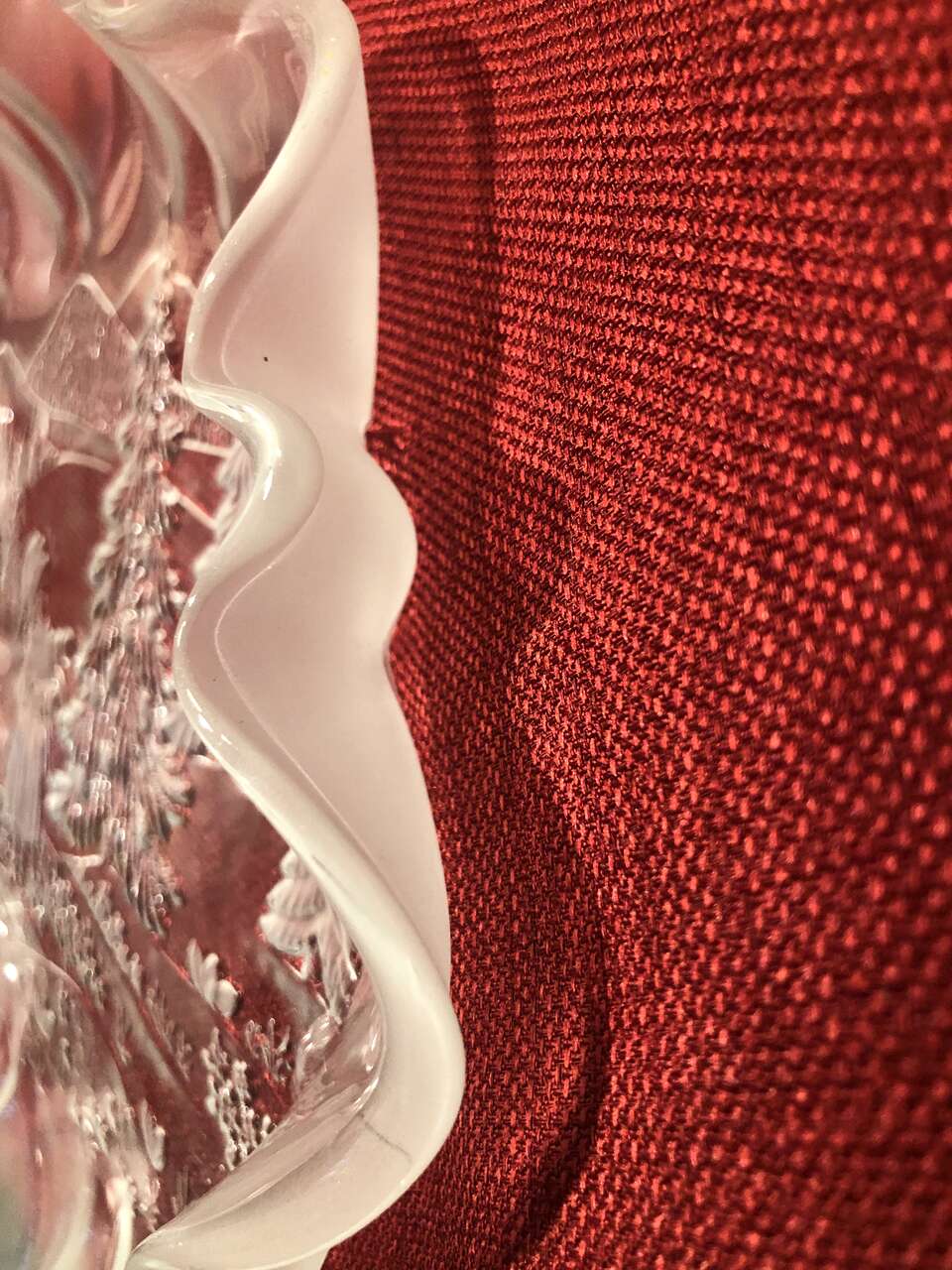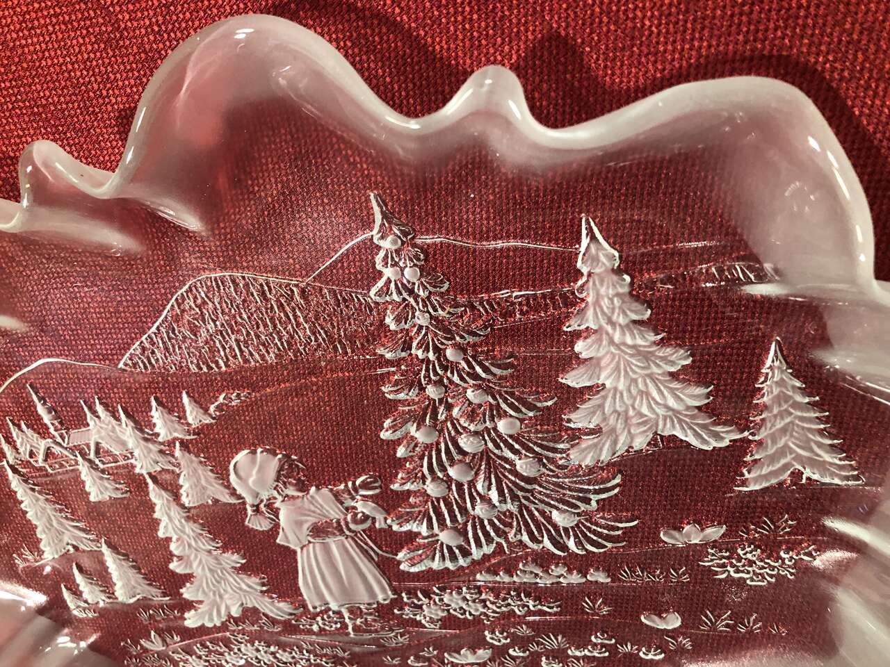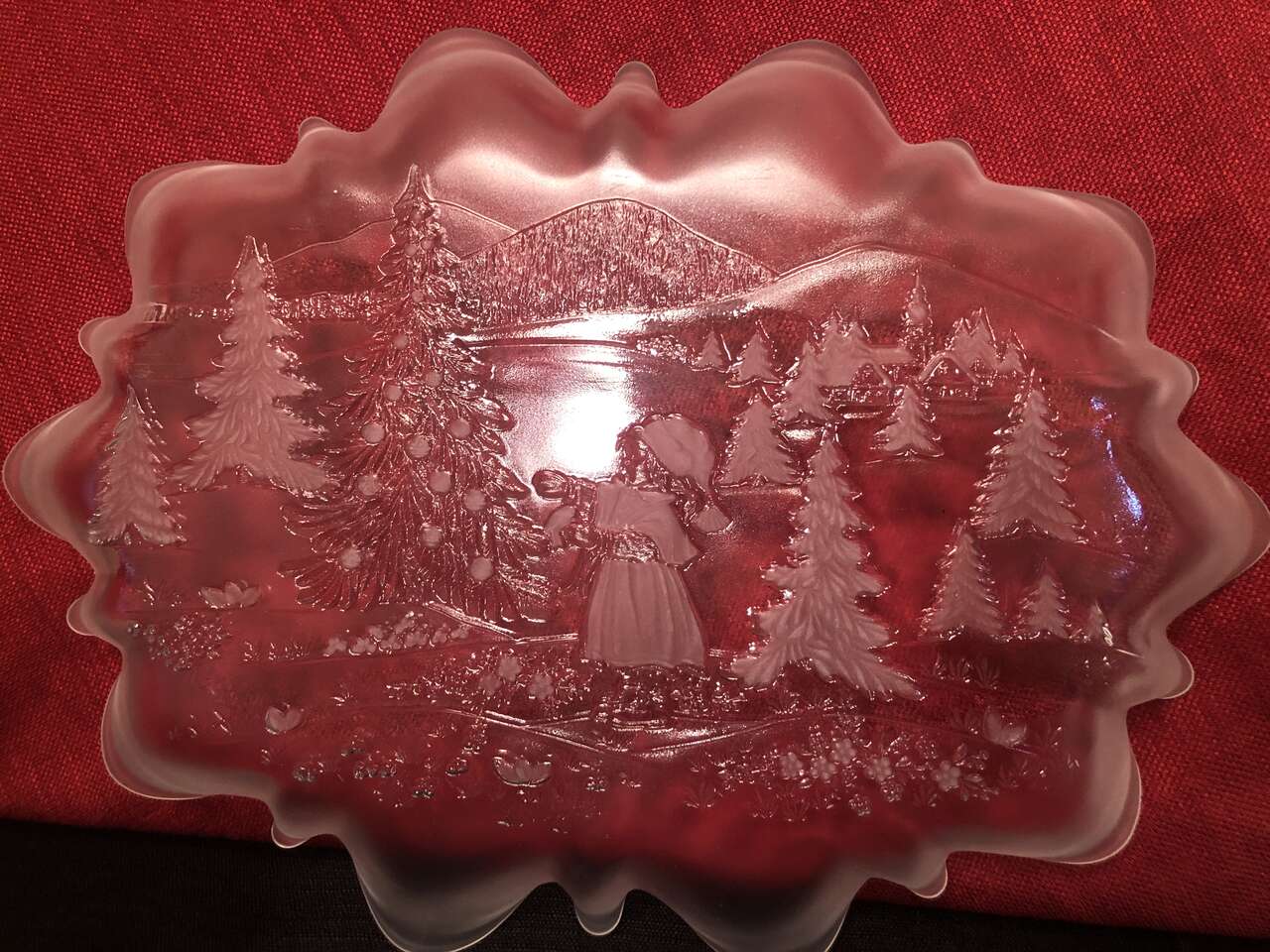 This is a stunning crystal platter with frosted edges to create depth to the images engraved in the center. You can feel the engravings on the back of the platter. The ruffled edges bring whimsy and movement to this piece. It measures 17"x12"x1".