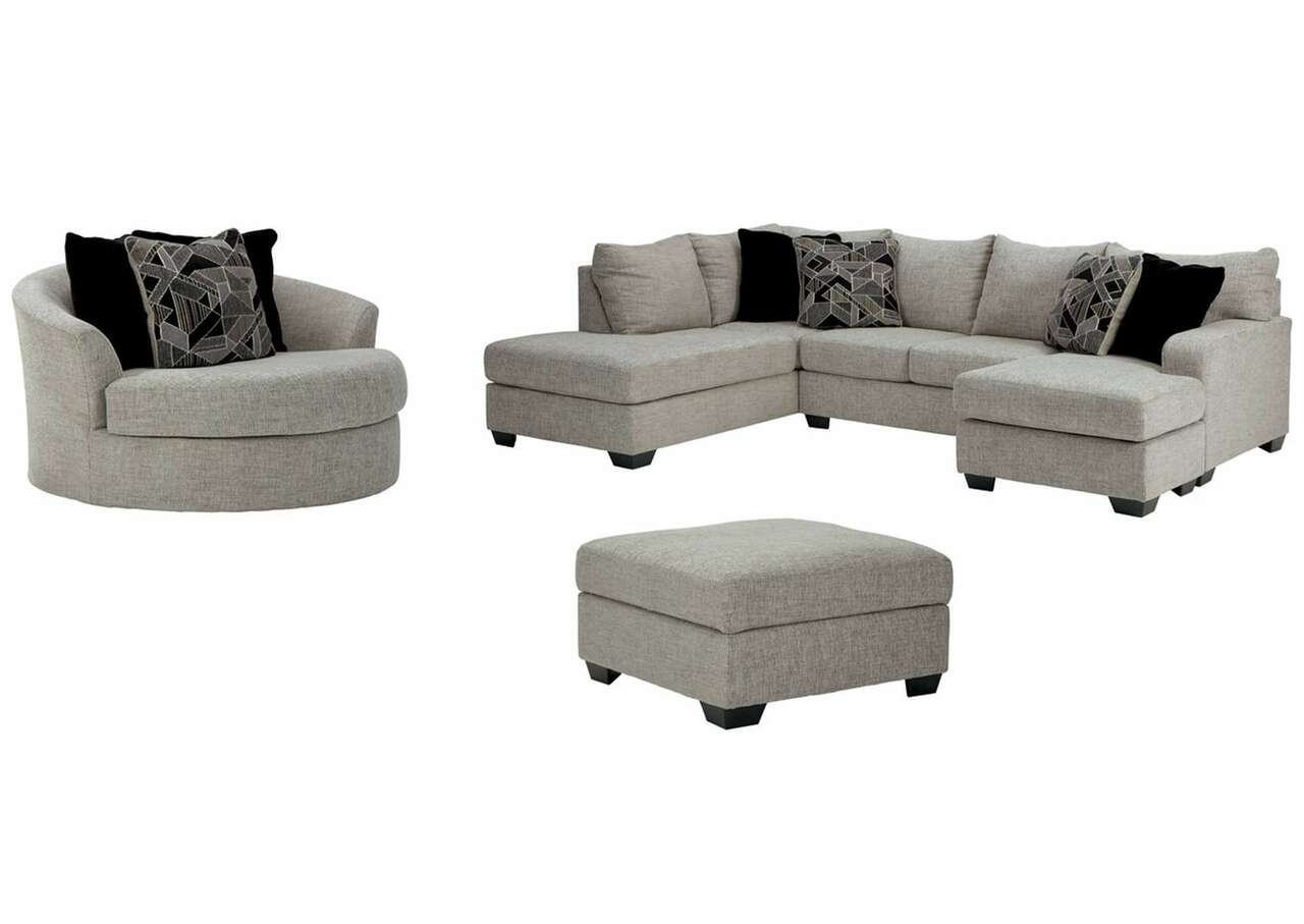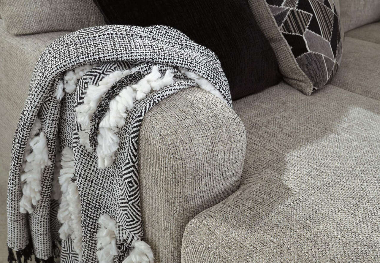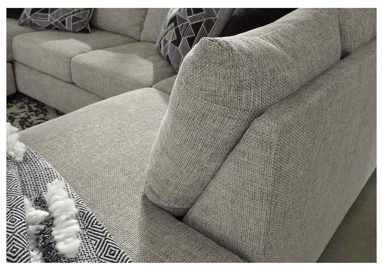 As much as you love clean-lined, modern furniture, you want to keep the vibe relaxed and comfortable. Rest assured, this living room set has that look and feel mastered. Perfect for fashion-forward family rooms, where everyone is welcome to kick back, this designer ensemble with 2-piece sectional, chair and ottoman will win everyone over with its spacious, sumptuous seating. Richly textured, with specks of black and white peeking through, the storm gray upholstery is chic and sophisticated. Includes 2-piece sectional (with right-arm facing sofa chaise and left-arm facing corner chaise), chair and ottoman