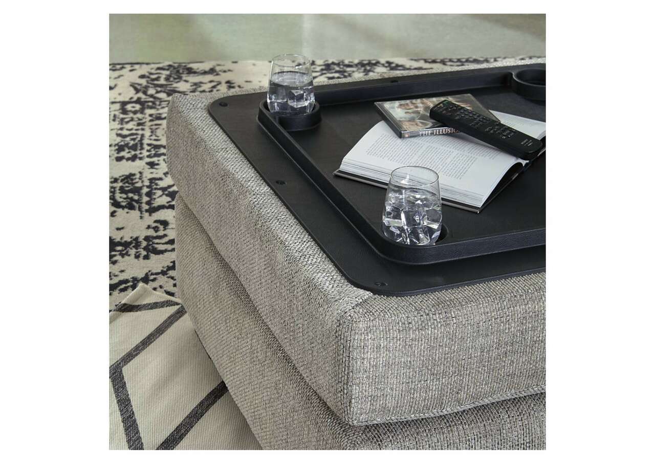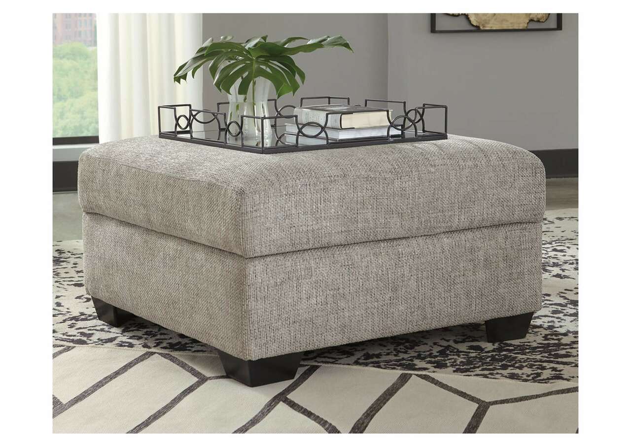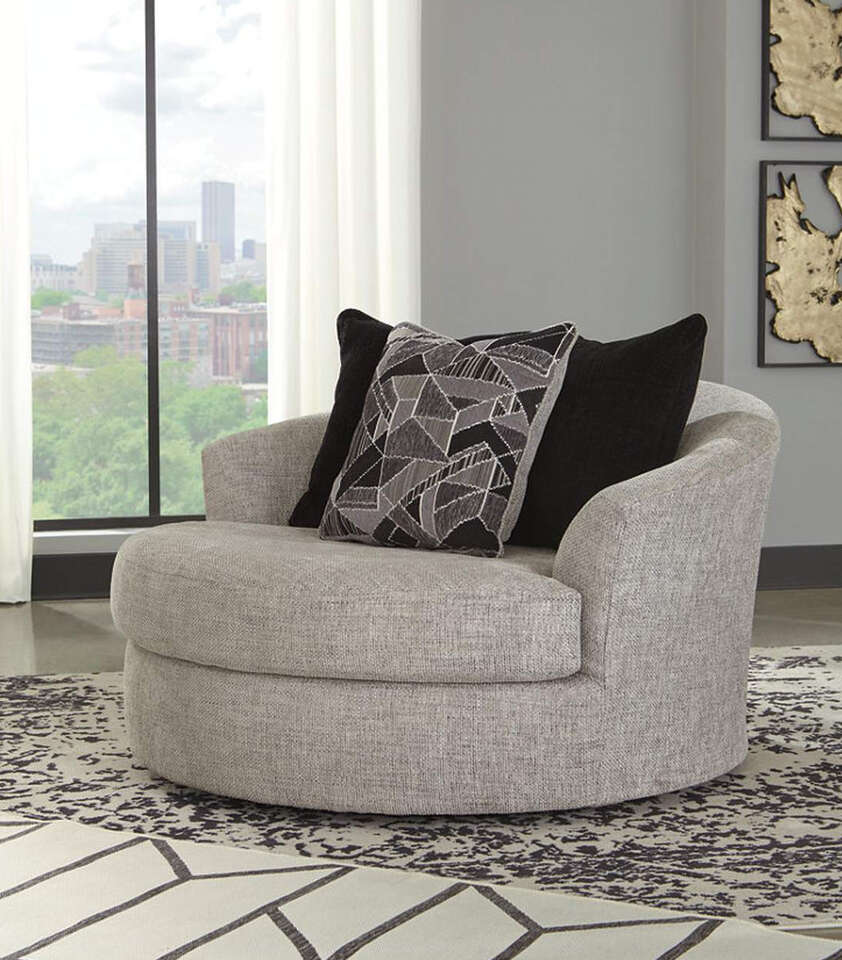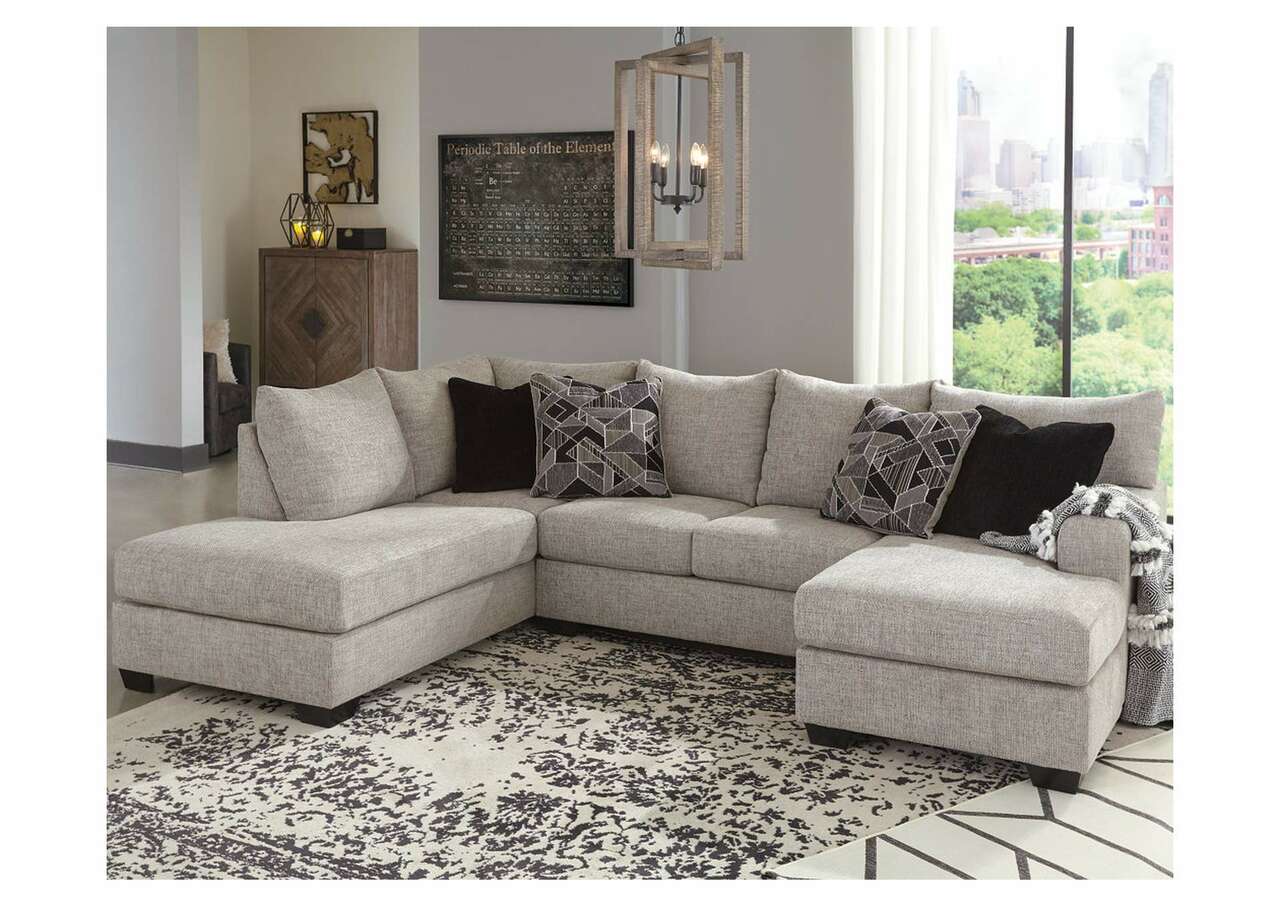 As much as you love clean-lined, modern furniture, you want to keep the vibe relaxed and comfortable. Rest assured, this living room set has that look and feel mastered. Perfect for fashion-forward family rooms, where everyone is welcome to kick back, this designer ensemble with 2-piece sectional, chair and ottoman will win everyone over with its spacious, sumptuous seating. Richly textured, with specks of black and white peeking through, the storm gray upholstery is chic and sophisticated. Includes 2-piece sectional (with right-arm facing sofa chaise and left-arm facing corner chaise), chair and ottoman