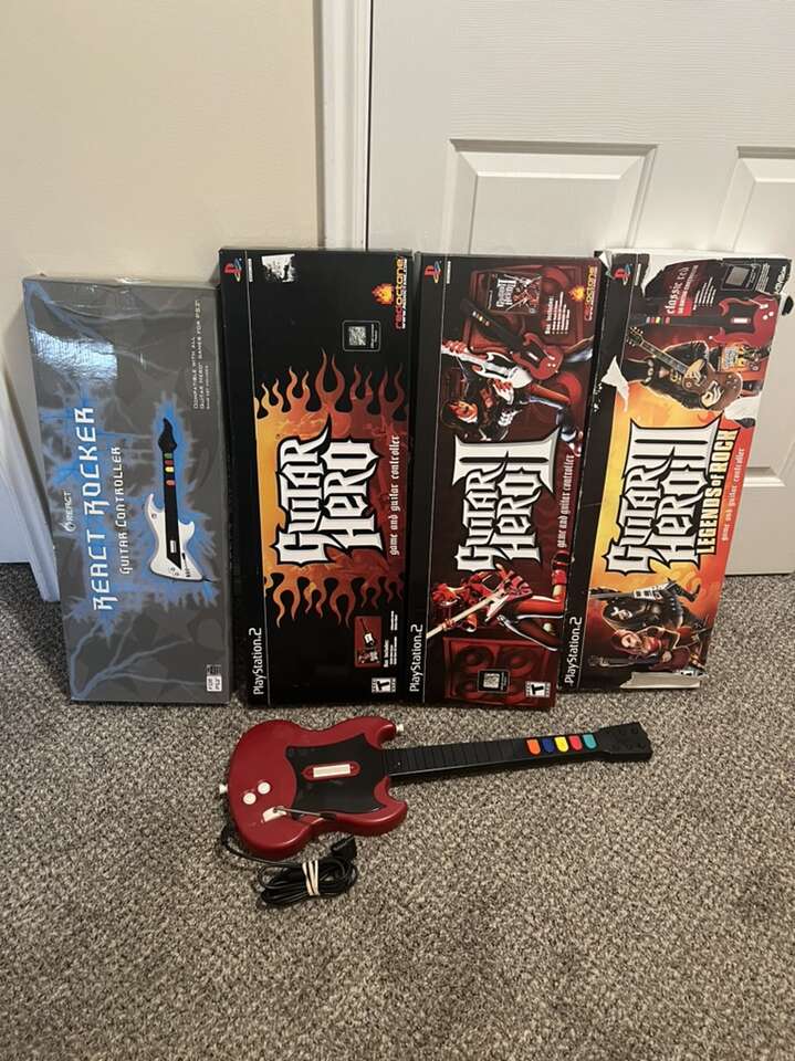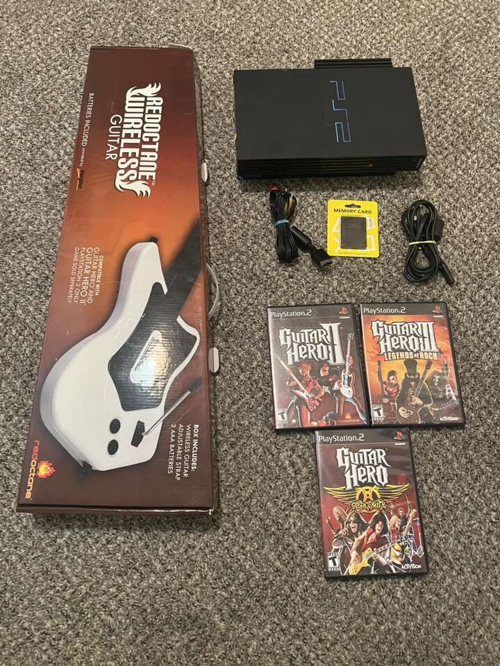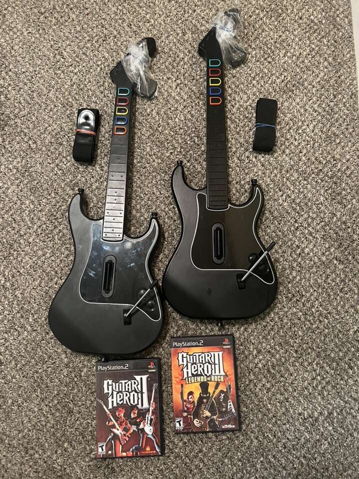 I’ve recently received some PS2 guitars, WITH THE DONGLES, and many still in the box! Every wireless guitar I sell comes w/matching dongle, so there’s never a mix up. I also have wired guitars available as well. I have many games, a PS2 console, controllers, memory card, and much more. I also have both complete drum sets available.