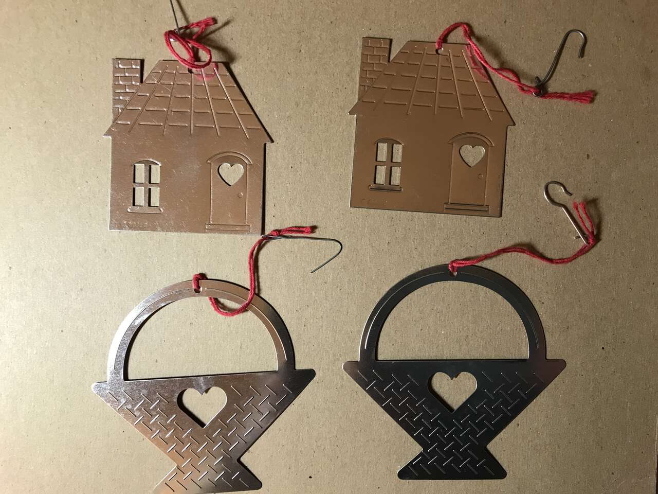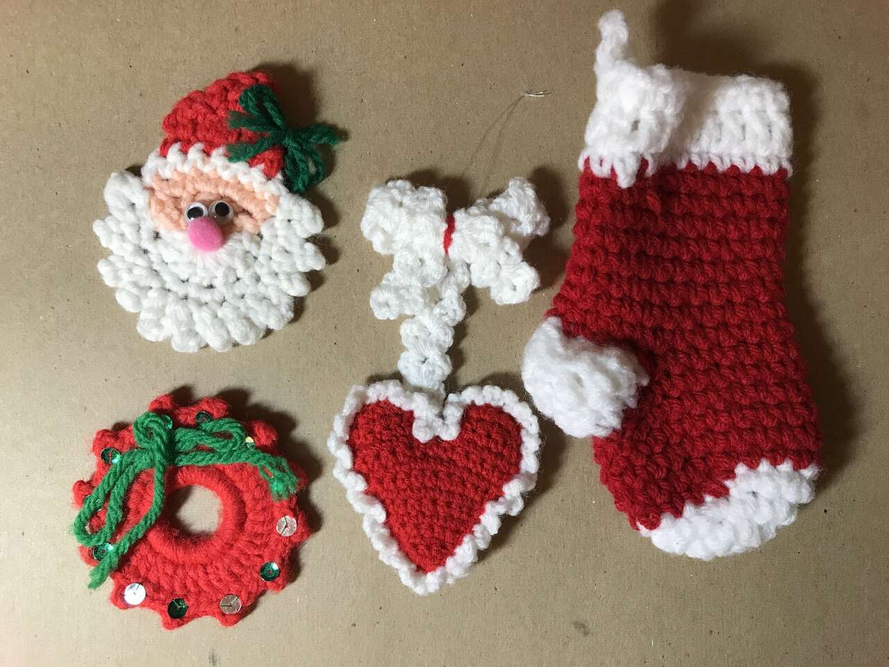 4 Crocheted Ornaments, pic 4 and 5 Crocheted Silvery Pink Ornaments, pic 5 and 2 clip on Snowmen ornament 5 1/2" tall, pic 6. 7 die cut Chipboard Ornaments. The tallest ornament is 5". The first 3 were manufactured in 1984, pics7 - 8. $10.00