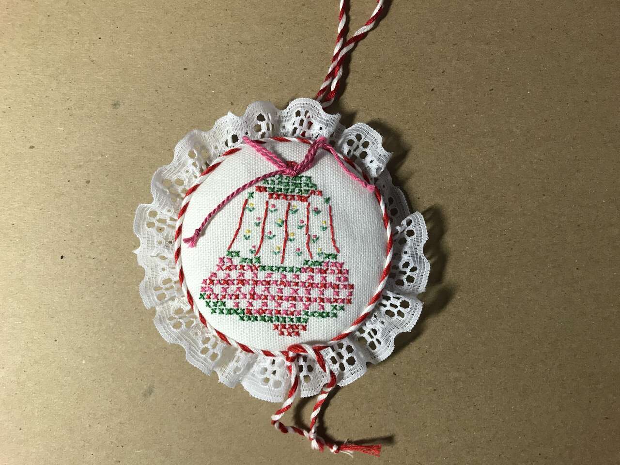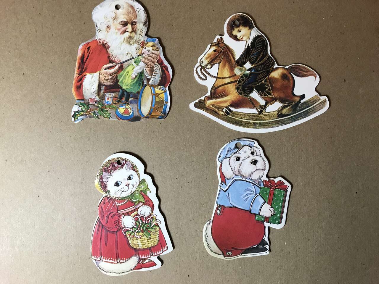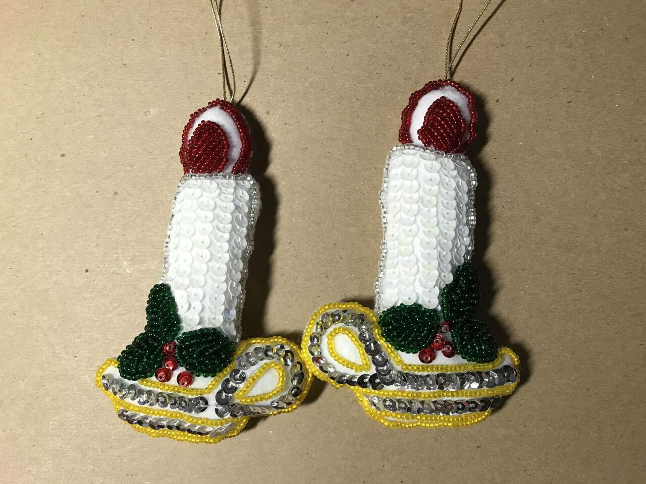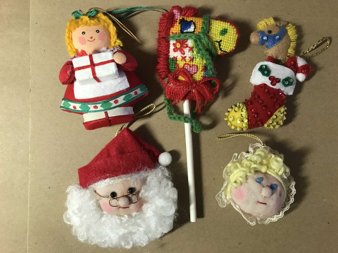 Tree Ornaments, Handmade Needlepoint Stick Horse (same on both sides, 8" long), $10.00. Stick Horse no longer available. Handmade Mr. & Mrs. Santa, Handmade Stocking filled with stick horse and candy cane sequined and beaded on felt and Stuffed Doll made of fabric, pic 36. $10.00 for 4.