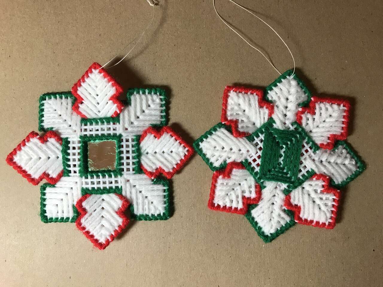 5" Plastic Canvas ornaments, 8 have a tiny mirror in the middle and 3 have yarn, pics 14 - 15. $10.00 for 4 & $10.00 for 3 without mirror