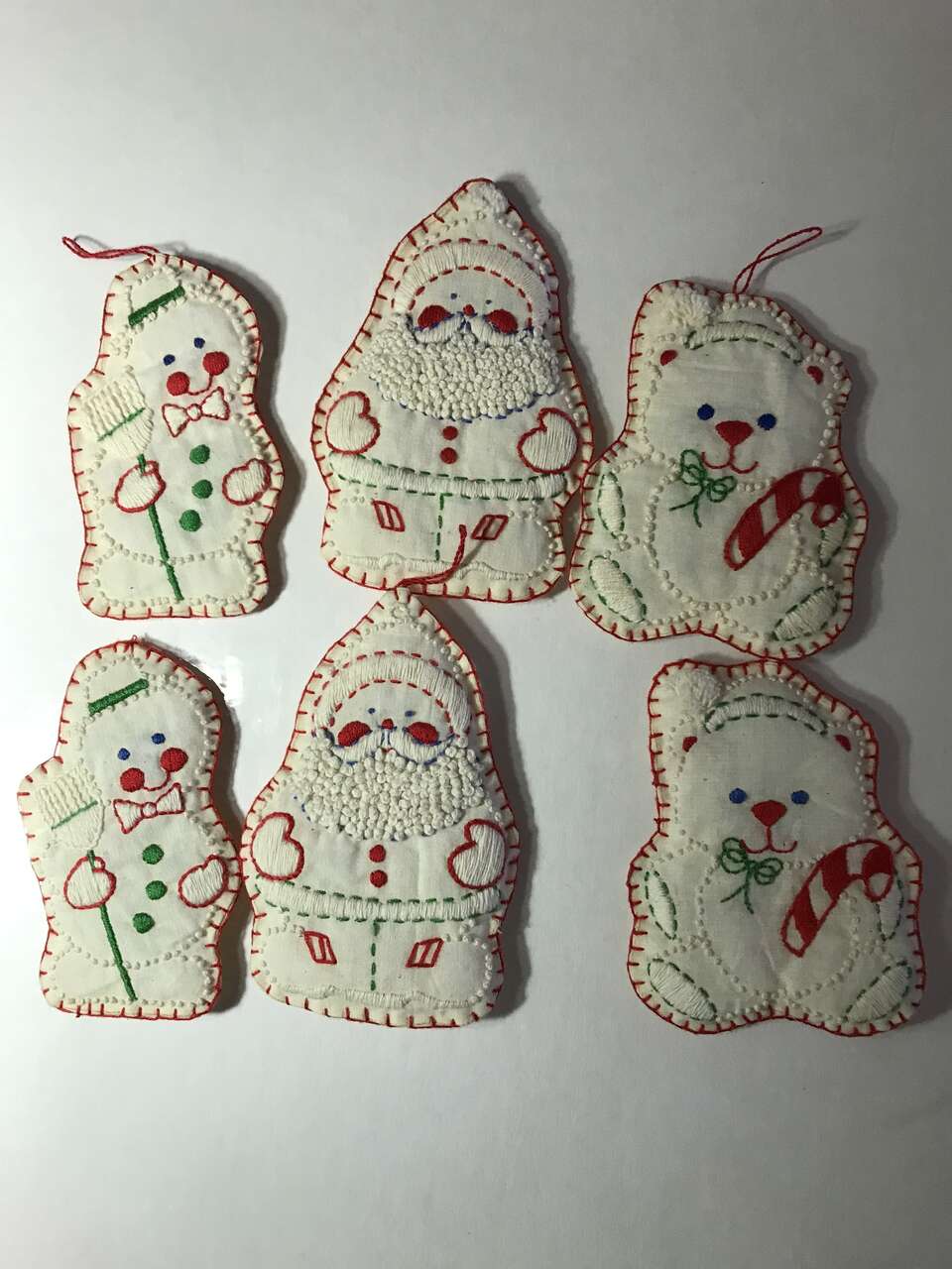 Set of 6 Crewel Embroidered Ornaments, 2 Santa, 2 Bear and 2 Snowmen 4 1/2 - 5 inches, pic 21. $10.00