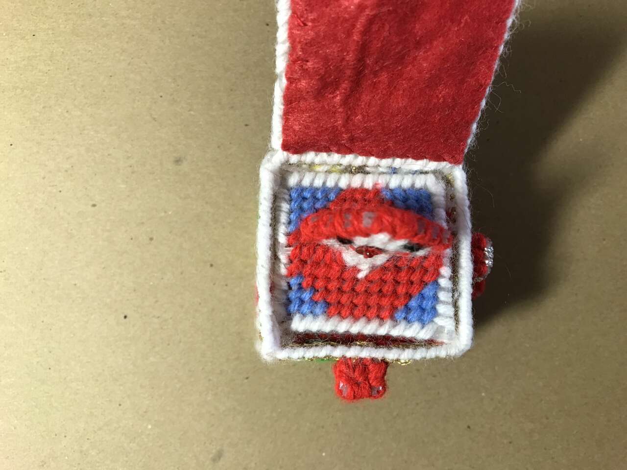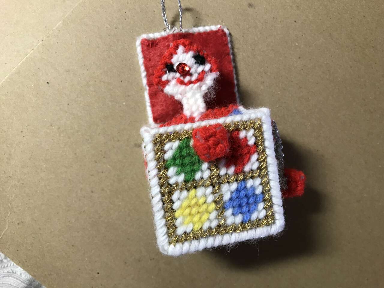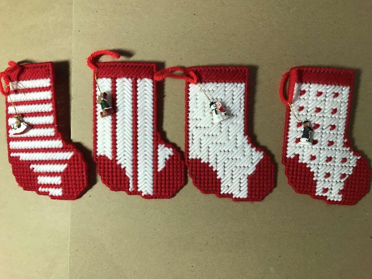Set of 4 Plastic Canvas Needlepoint Stockings with miniature hanging ornaments, and 1 Jack-in-the-box Plastic Canvas handmade ornaments, pics 37 - 41. $10.00