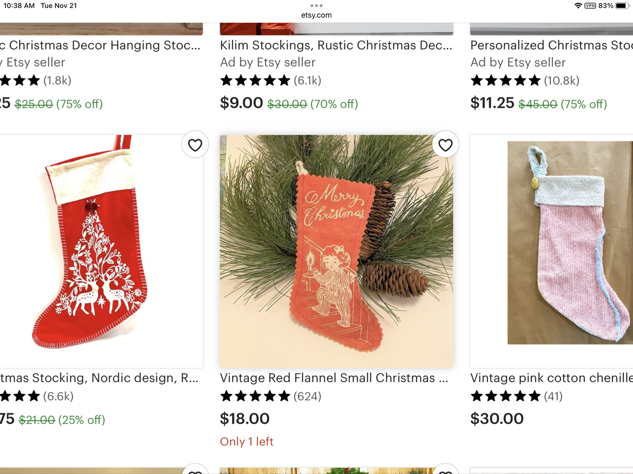 Vintage Red Flannel Small Christmas Stocking: 1950s, 7 1/2" and 1961 Mini stocking, pic 42. Picture 43 shows one similar on Etsy. Pick 1 $10.00 each