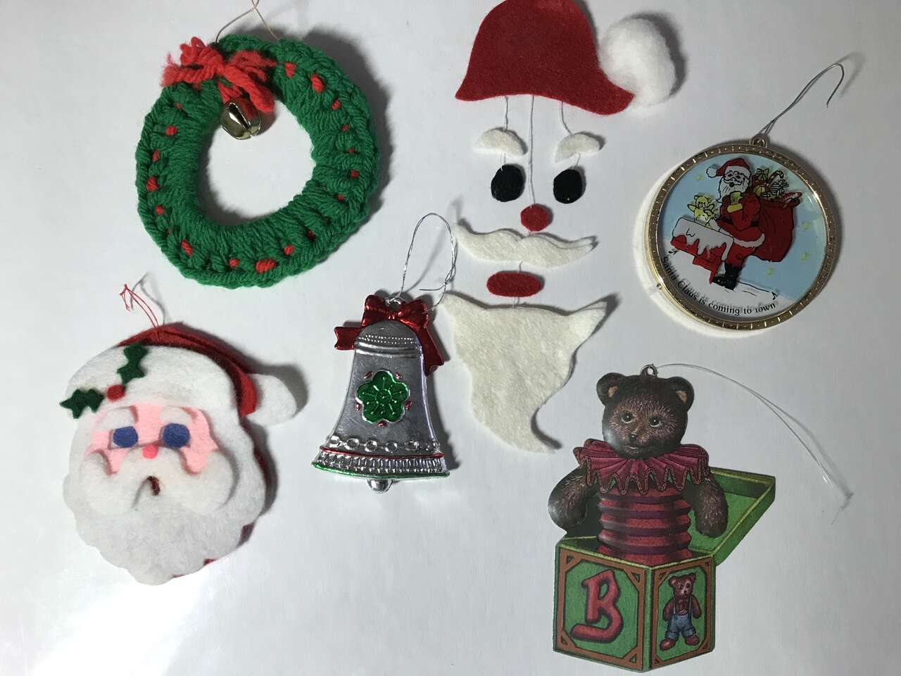 Set of 5 Hand Stitched and Stuffed ornament, Tree, Stocking, Bell, Candy Cane and Wreath, pics 28 - 33. $10.00