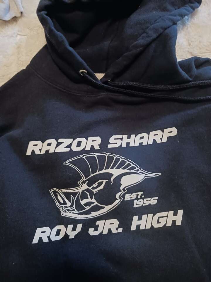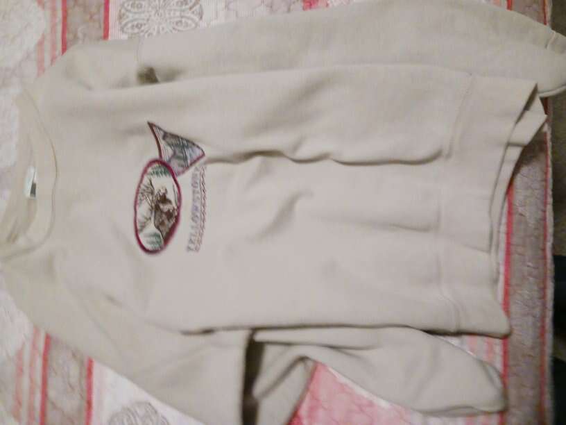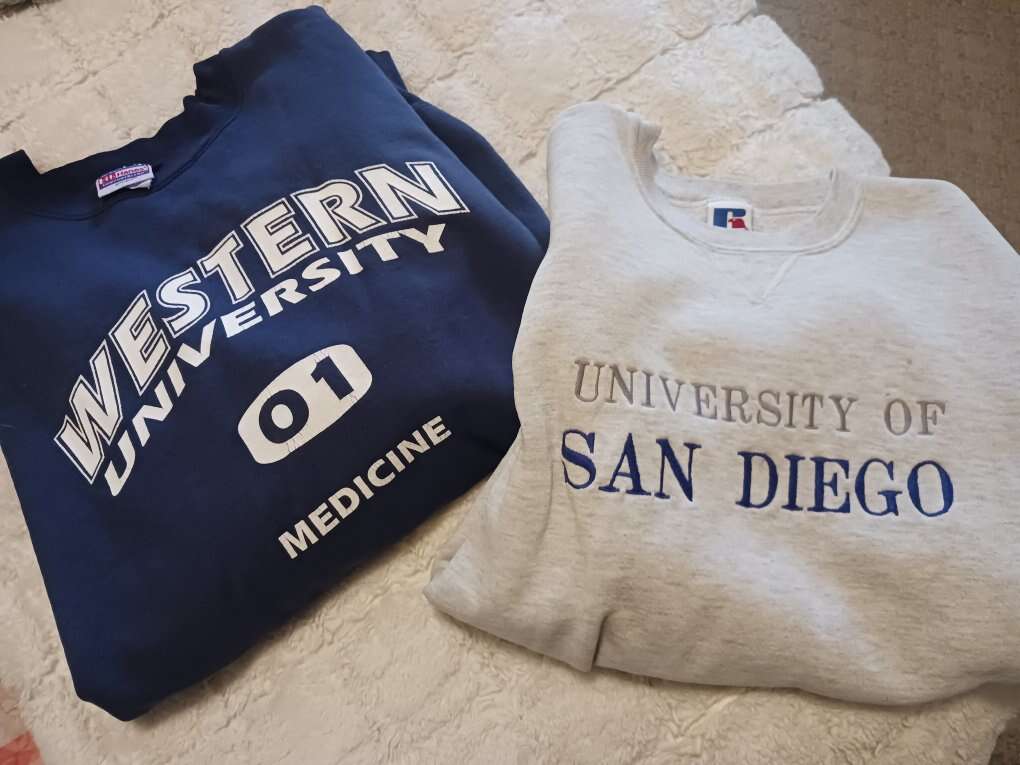 Heavyweight men's sweatshirts. (4 available)Yellowstone motif, Tan; Western University Medicine, blue; University of San Diego, gray; and Roy Junior High Razorbacks, blue. 5.00 each or 3/10 or all four for 15.00.