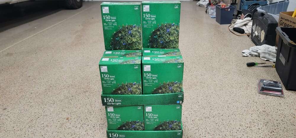 New multicolored Dome LED Net light sets. 4 ft x 6 ft. I have 7 new boxes. Can be used to hang on deck railings; deck walls; or over shrubs. Indoor/outdoor use. Last year these sold for $20 plus tax at Home Depot. This year they are $29.98. So $10 is a steal!