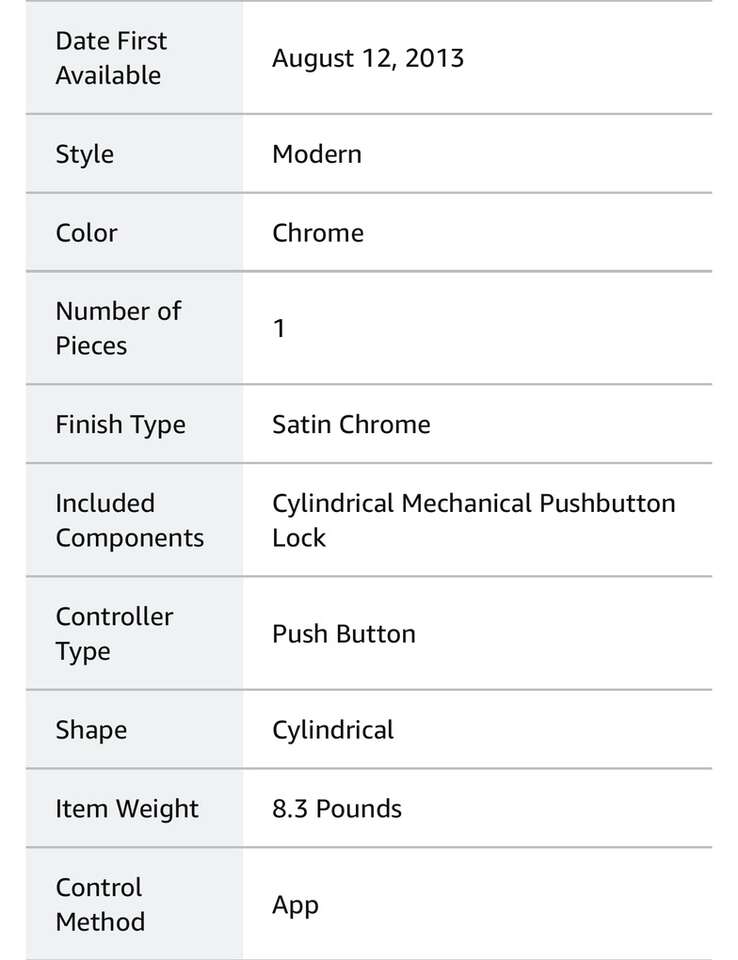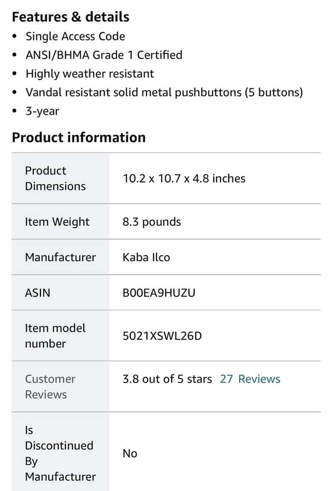 Simplex mechanical pushbutton locks offer a convenient way to control access between public and private areas. There are no keys or cards to manage, no computers to program, no batteries to replace, and combinations can be changed in seconds without removing the lock from the door. Features: Meets BHMA Grade 1 certification security standards Single code combination entry with a key override Handing is reversible for either left or right door applications Intended for easy installation into wood or metal doors 1/2 inch cylindrical throw latch Kaba Ilco offers a 3-Year Americans with Disabilities Act (ADA) compliant Mounting hardware is included Specifications: Backset: 2-3/4 Cross Bore: 2-1/8 Door Thickness: 1-3/8 to 2-1/4 Handing: Reversible Left or Right Exterior Height: 8-7/8 Exterior Width: 3-3/8 Product Weight: 9. 25 lbs. Cylinder: 6 Pin C Keyway
