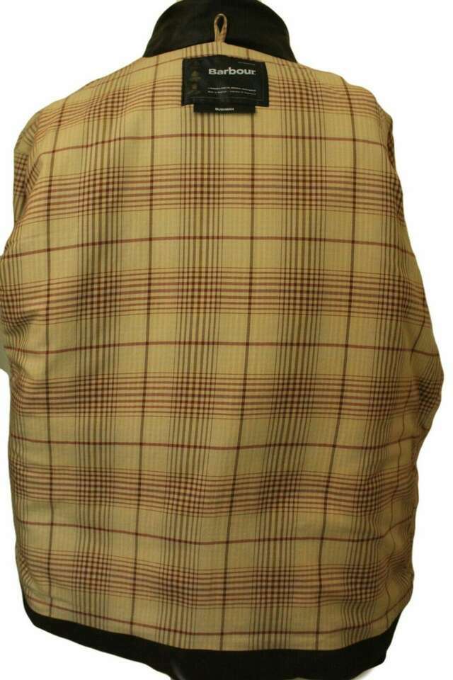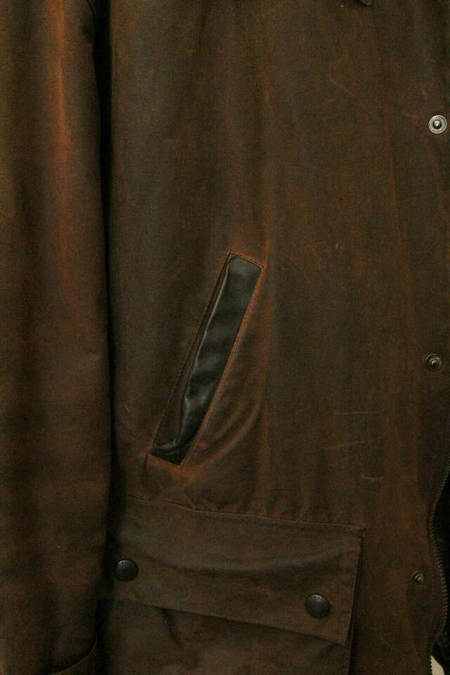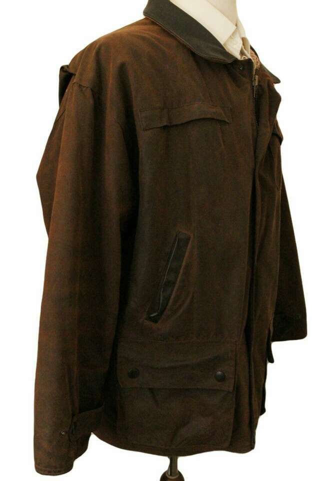 Large Barbour Bushman jacket in brown waxed cotton with leather accents.