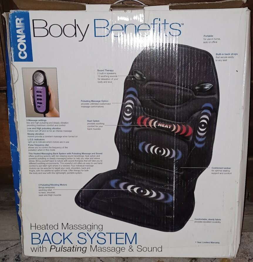 Conair Body Benefits Heated Massaging Back System with Pulsating Massage and Sound. In great condition. Only used a few times. In box. FCFS Cash price listed.