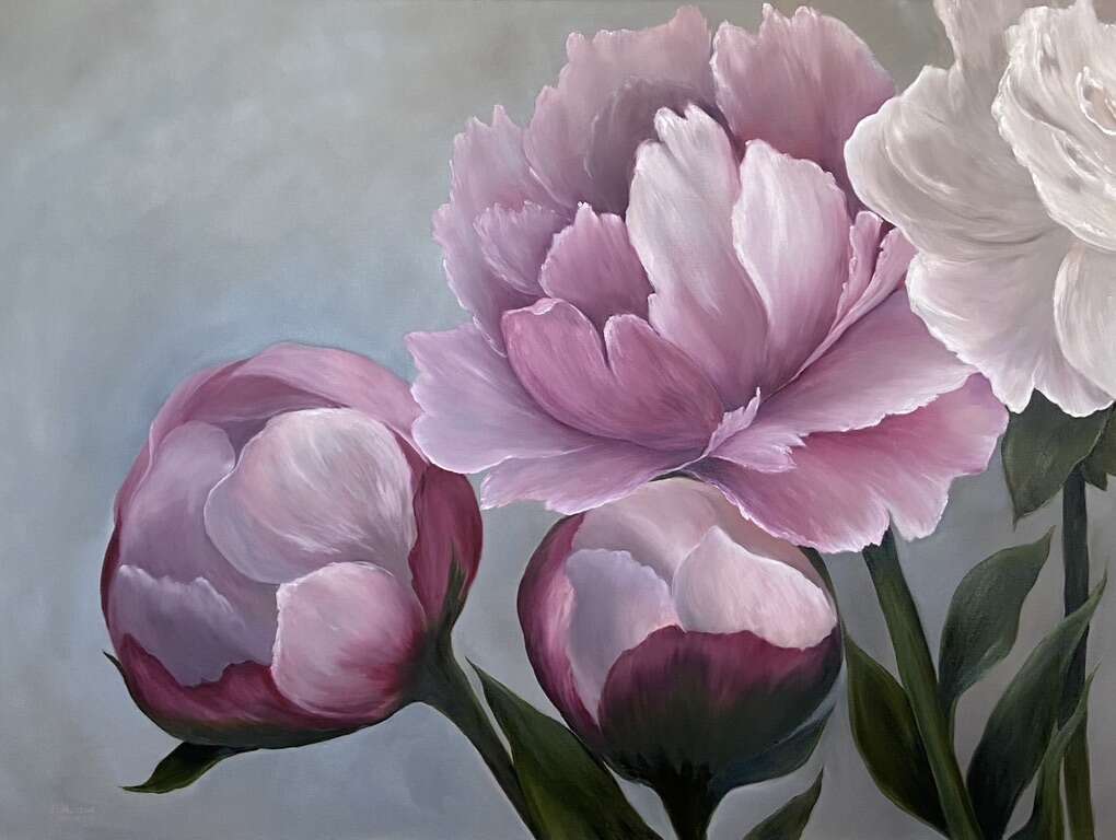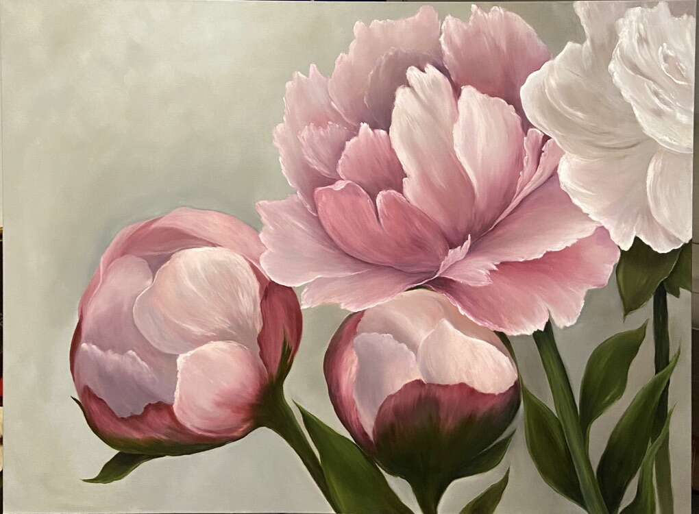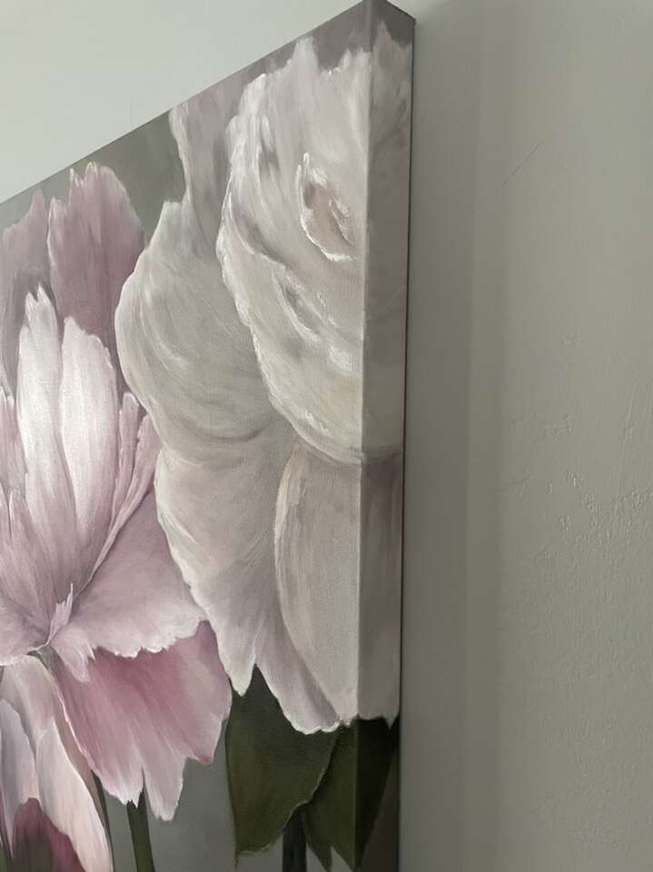 3 feet by 4 feet This is a large oil painting is on deep gallery wrapped, heavy duty canvas on a wood frame. These peonies are pleasing an tranquil. The painting continues around all 4 edges of the canvas thus there is no need to frame it. The size is perfect for defining a space and drawing a room together. Ideal for a living room, great room, dining room or bedroom. Signed and dated by artist. *Check out my by this seller and find me on Instagram @jen_paints_sometimes I take Venmo. @Jen-Hestad Call or text anytime 801-814-0577
