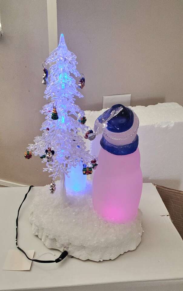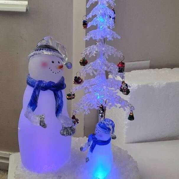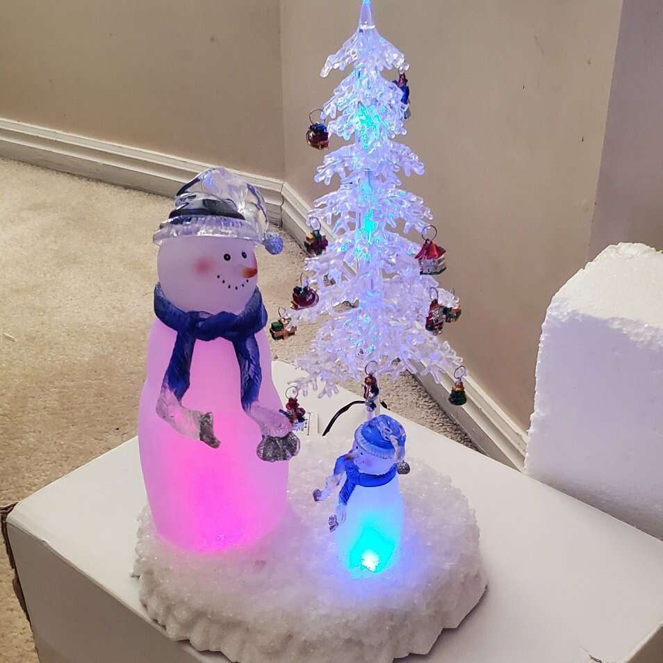 Color changing acrylic Snowman and baby Snowman woth acrylictree and ornaments . Stands 14 inches high by 9 inches round stand. Comes with adapter for electrical outlet. Perfect for before and after Christmas