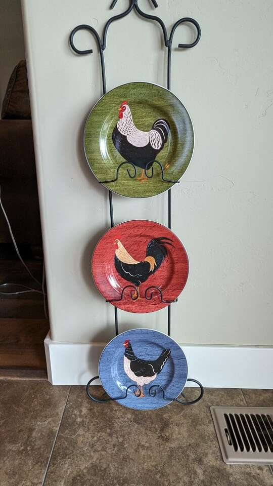 3 Warren Kimball/ Country Quartet plates with plate hanger. I displayed this in my kitchen for years. I found something else to replace it. The plates are hard to find and part of a collectable series, however, I do not have any other pieces of the set. Wonderful condition. No scammers please.