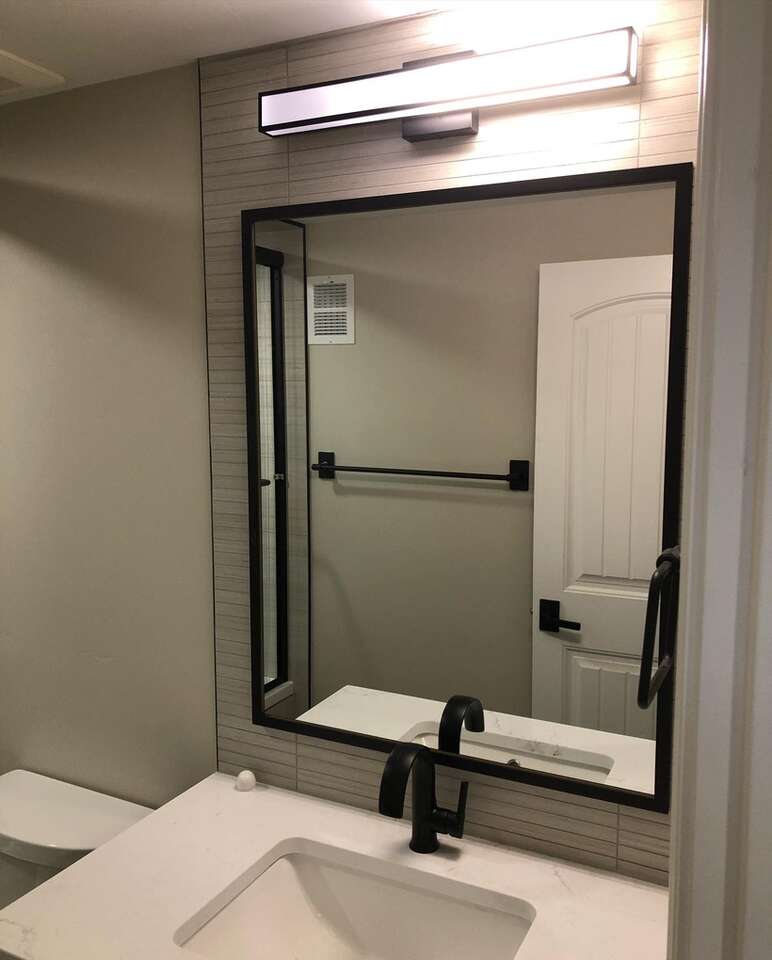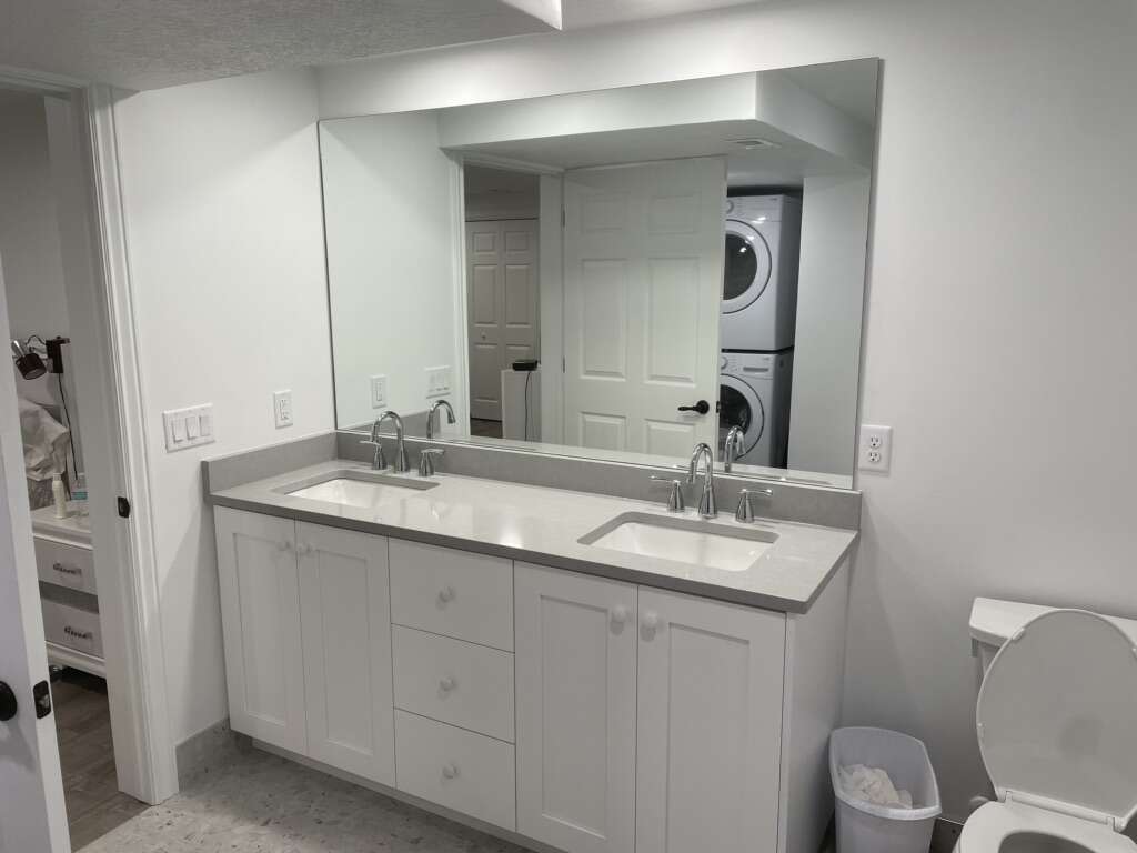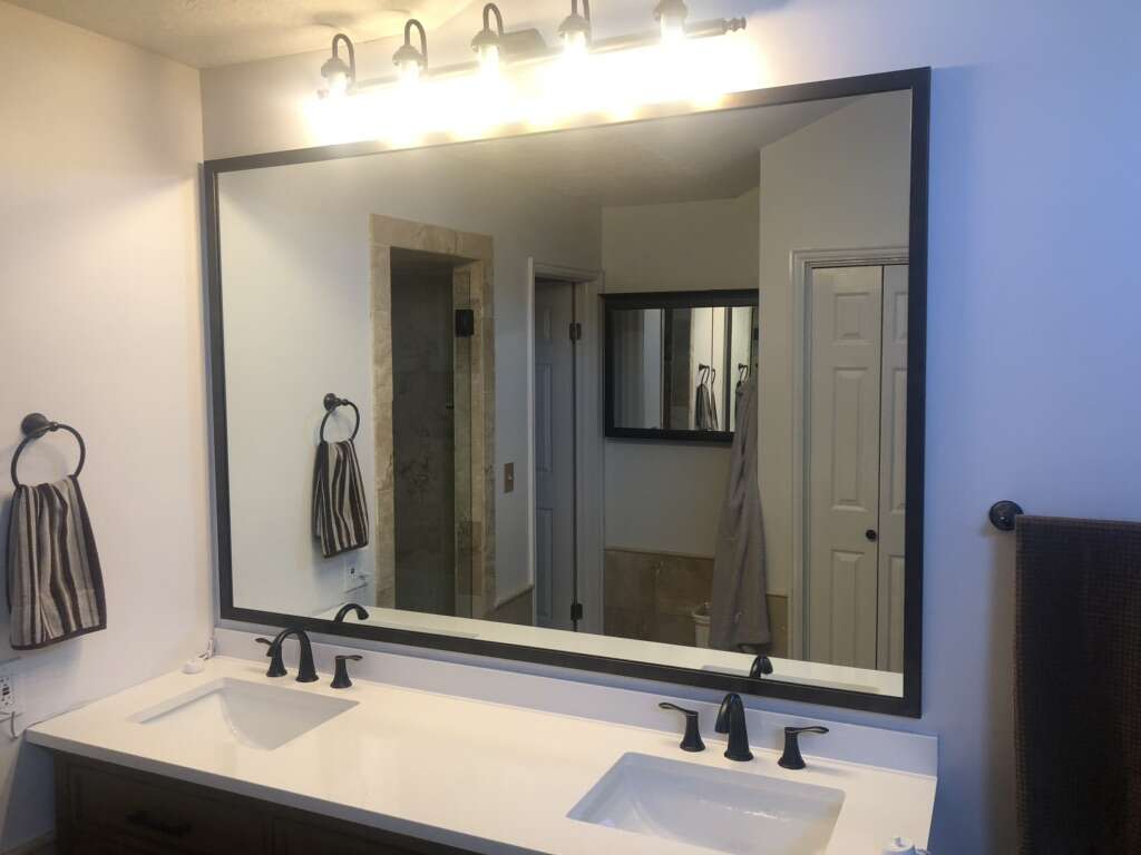 Bathroom mirror. Can also cut to custom size, and install. Basic contractor grade frameless, or mount into custom frame of your choice. Up to 42” x 130” Home, living room, bathroom, gym, shop. Installation available.