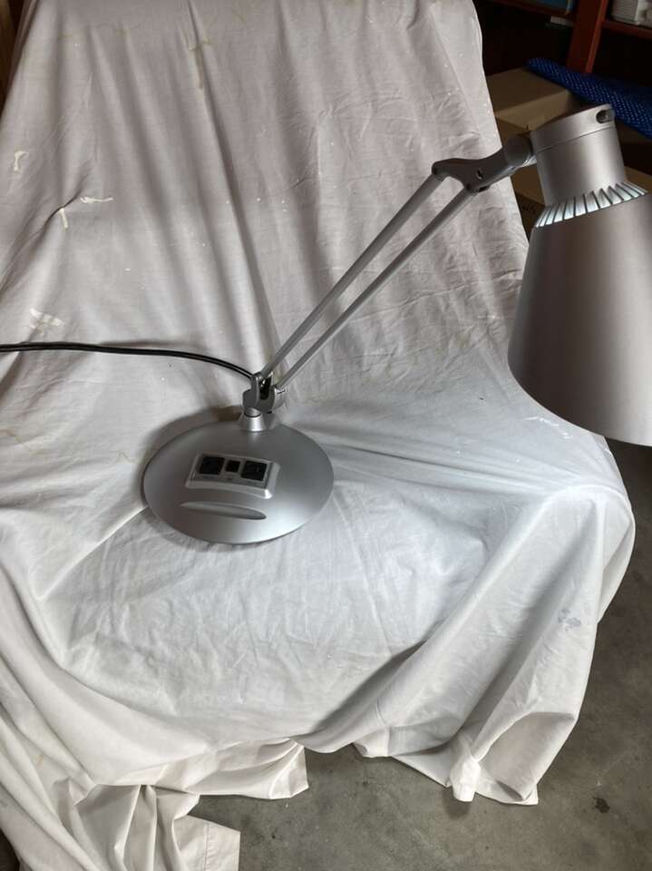 VenmoHeavy base, adjustable arm with outlets for power in the base. About 28” with arm straight up. Base is about 10” in diameter. Eight foot cord. Cash or Venmo only. Texting is best. Cary