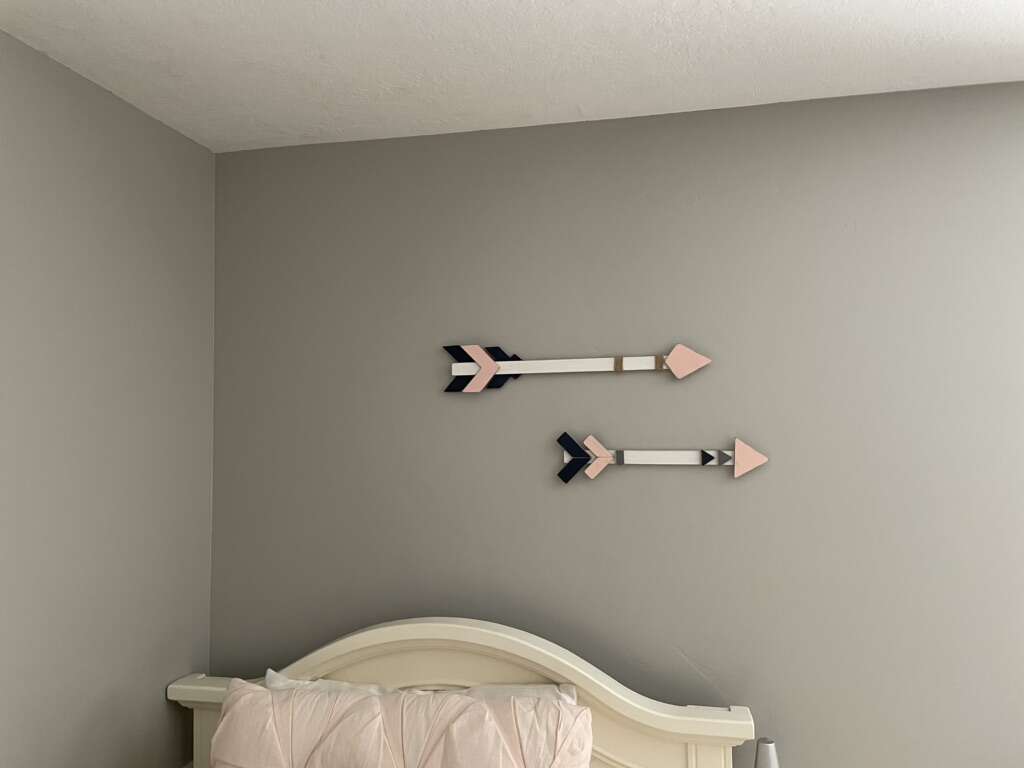 Wall decor for girls bedroom. Navy blue, gray, and pastel pink. Great condition. Includes: Set of three wall flowers (16”, 13”, 7”), 16x20 inch framed saying (there is sunshine in my soul), and set of two arrows 21”L and 16”L.