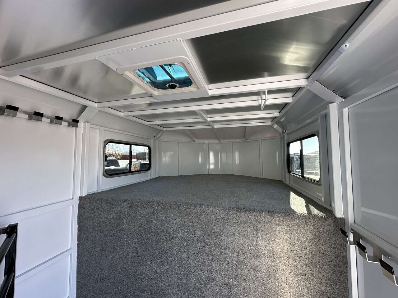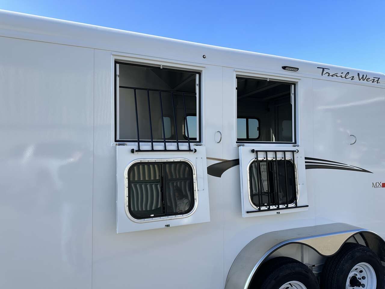 The Adventure MX trailer from Trails West is the best priced steel framed aluminum skinned trailer in the industry. It has the perfect combination of style, user friendly features, and value. This trailer has newly designed aerodynamic front, head side drop down feed windows, tail side sliding windows and rubber wall mats all the way around the horse compartment making it the best equipped trailer in its class.