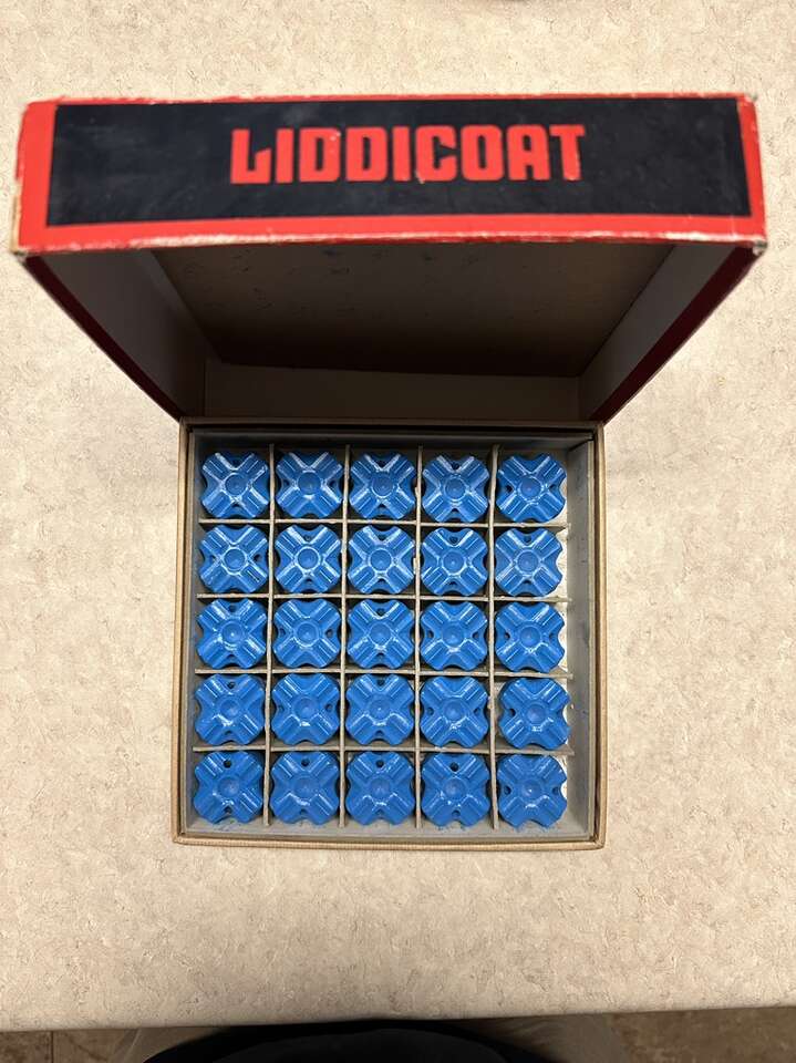VenmoThis vintage drill bit set from Tee-cee is a true gem for any DIY enthusiast or professional. With 25 detachable bits made of tungsten carbide, this set is perfect for drilling through a variety of materials with precision and ease. Each bit has a diameter of 1-1/2 inches and a width of 7/8 inches, making them suitable for all kinds of drilling tasks. The set is from May 14, 1957 as dated on the original box packaging and comes in a beautiful blue color. Whether you're a collector for your industrial cabinet of vintage drilling accessories or a commercial or residential user, this Tee-cee drill bit set is a must-have for anyone who appreciates quality tools. Originally made in the USA by Western Rock Bit Manufacturing Company out of Salt Lake. Really cool 25 pieces of history here.