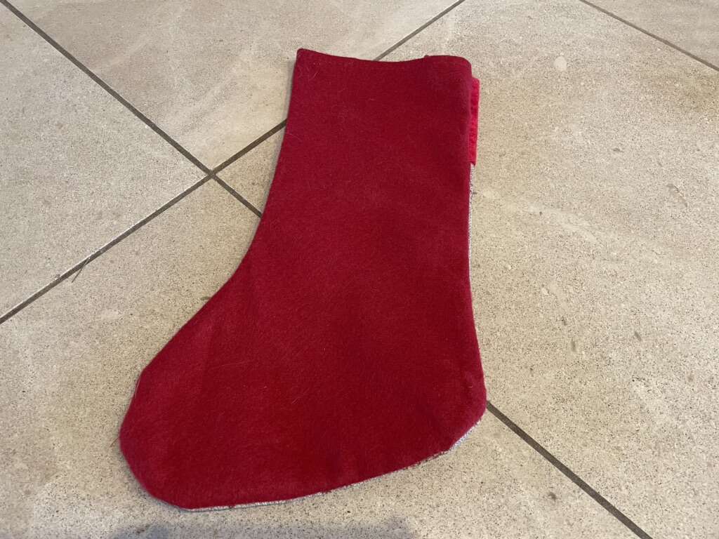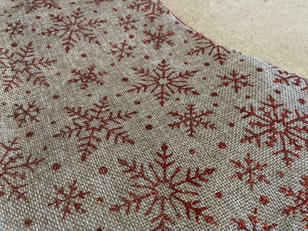 I have an almost new Christmas stocking that has a brown burlap look with red glitter snowflakes (they are more sparkly in real life than in the pictures). The back is a solid red. It is just over 16 inches long and has a loop for hanging. See my other ads for jewelry, artwork, home decor and more.