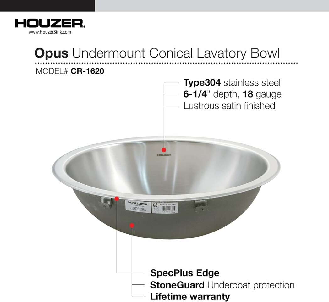 Houzer CR-1620-1 Opus Series Conical Undermount Stainless Steel Lavatory Sink