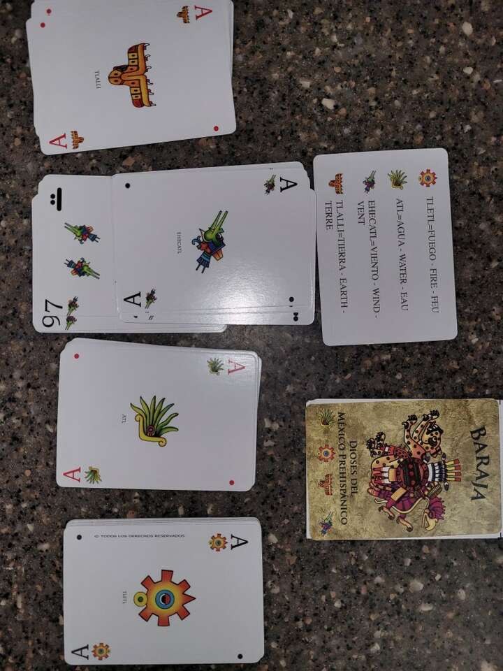 Fun playing cards, with each suite (hearts, spades, etc) replaced with pre-colombian Mexican deities.