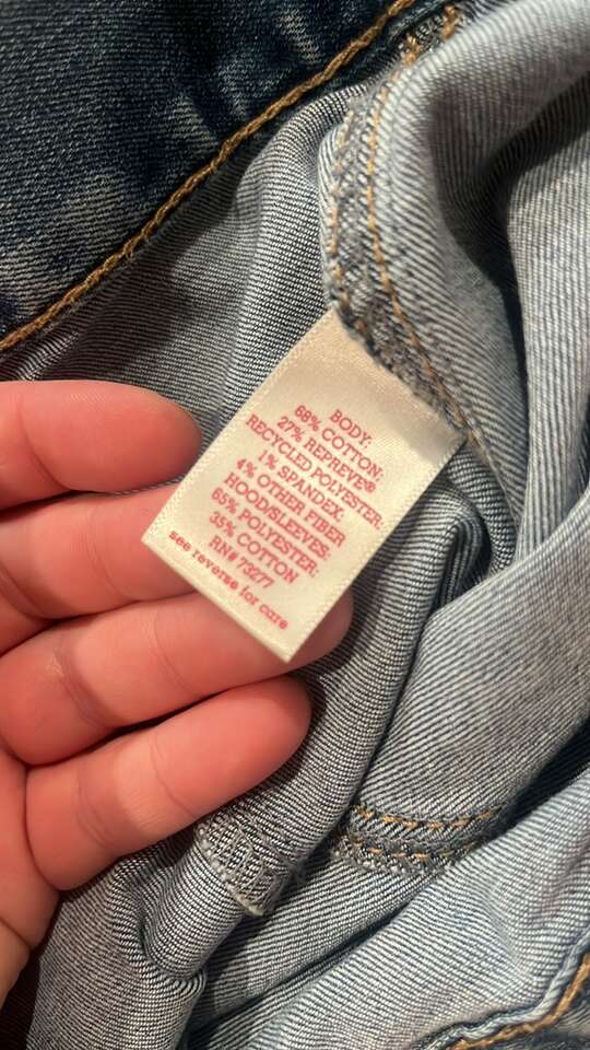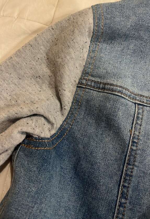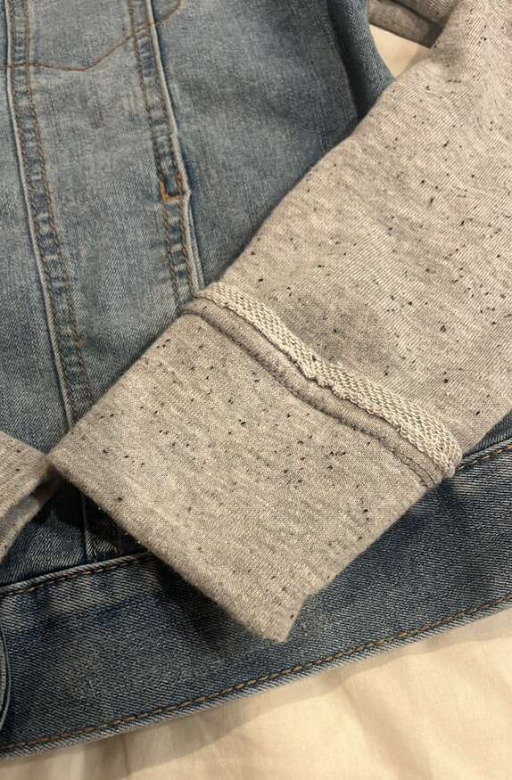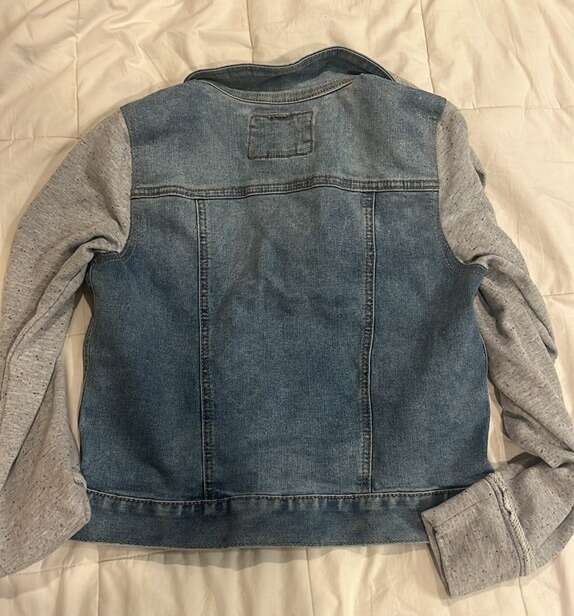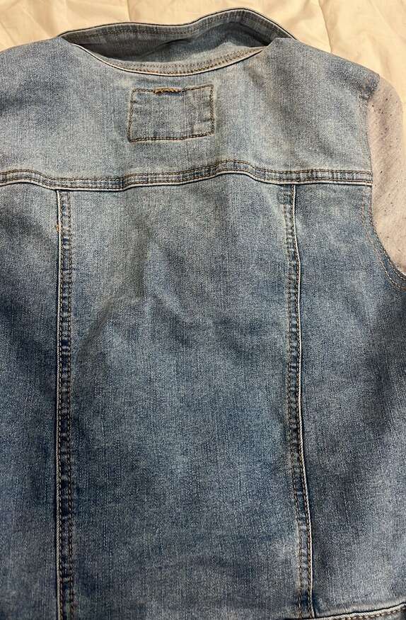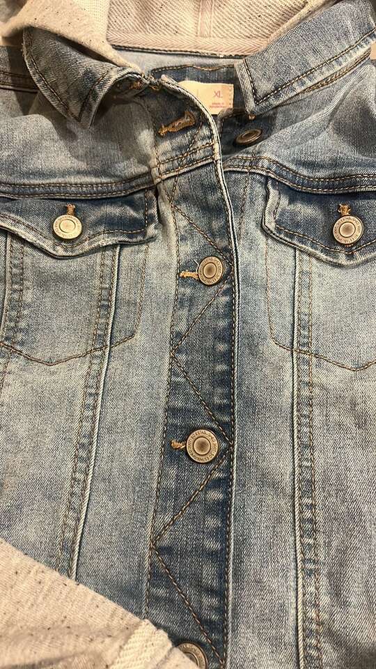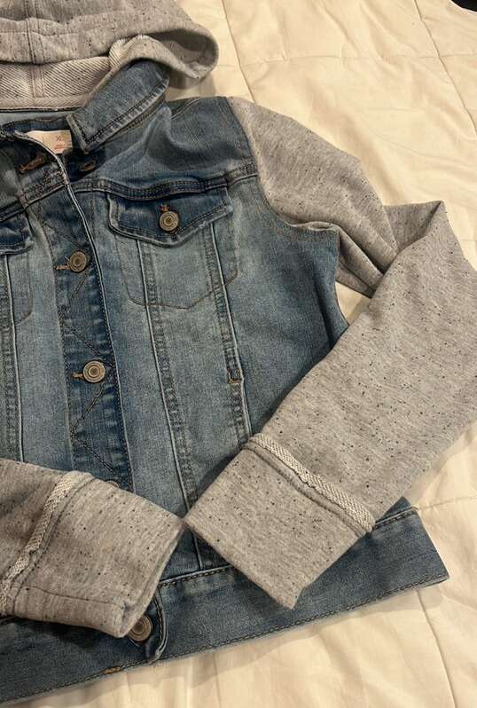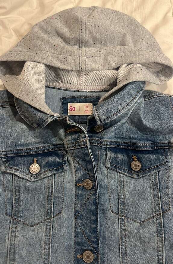 EUC- worn just a few time Girls size XL Blue denim vest with grey hoodie and sleeves SO brand Grey hood and sleeve have specs
