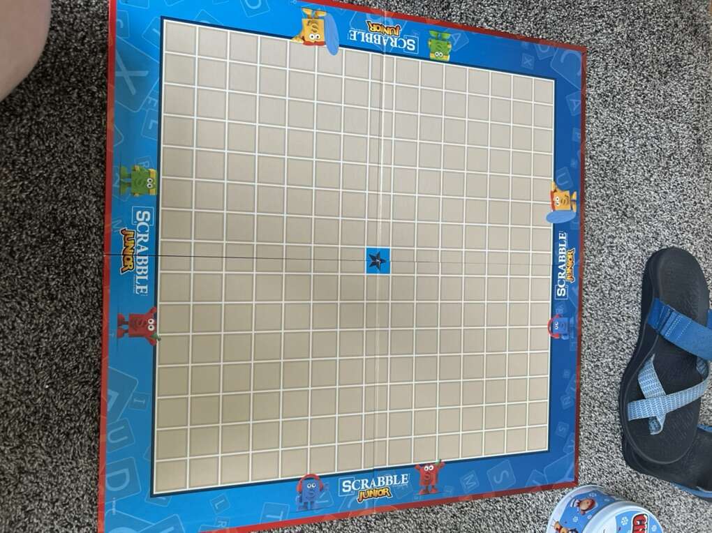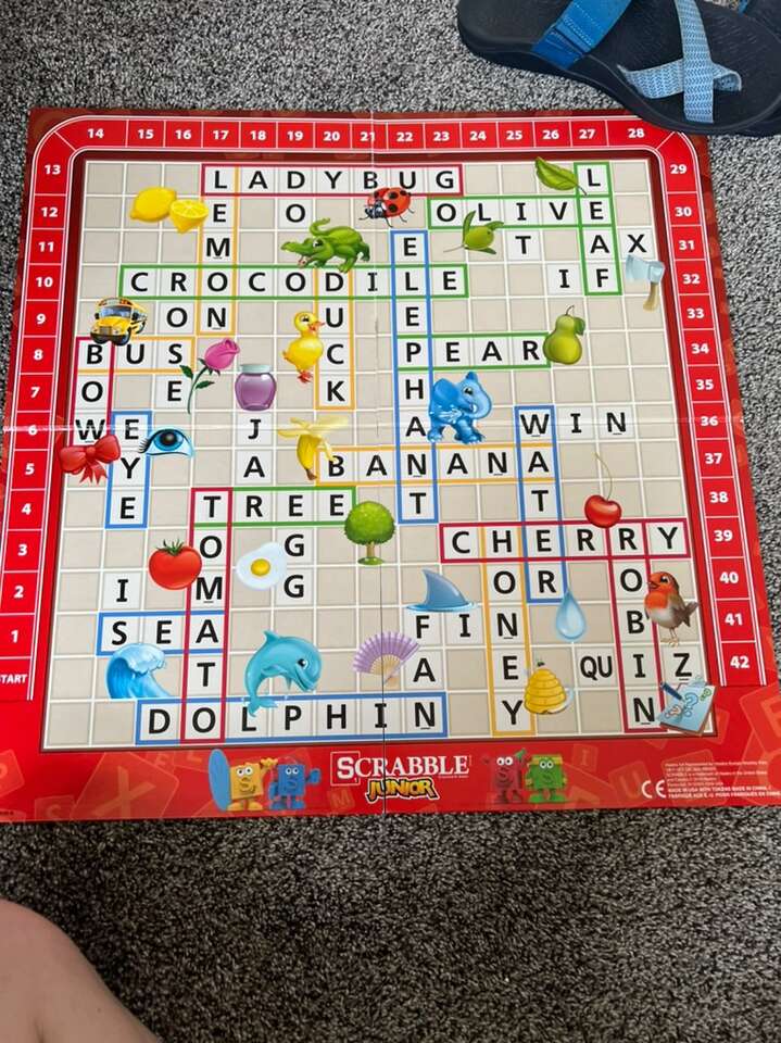Scrabble, junior game. We used this when we homeschooled, there’s two different sides of the board to play hard or easy.