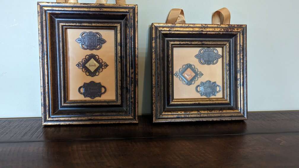 Small 2 set homemade pictures with frames. Super cute. Has a ribbon for hanging or you can hang by the hooks on the back. Changed up my decor and no longer needed. 8x6 and 7x7 No scammers.