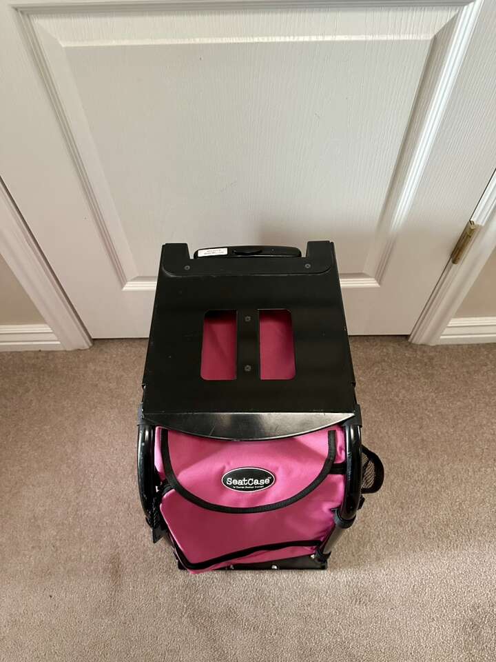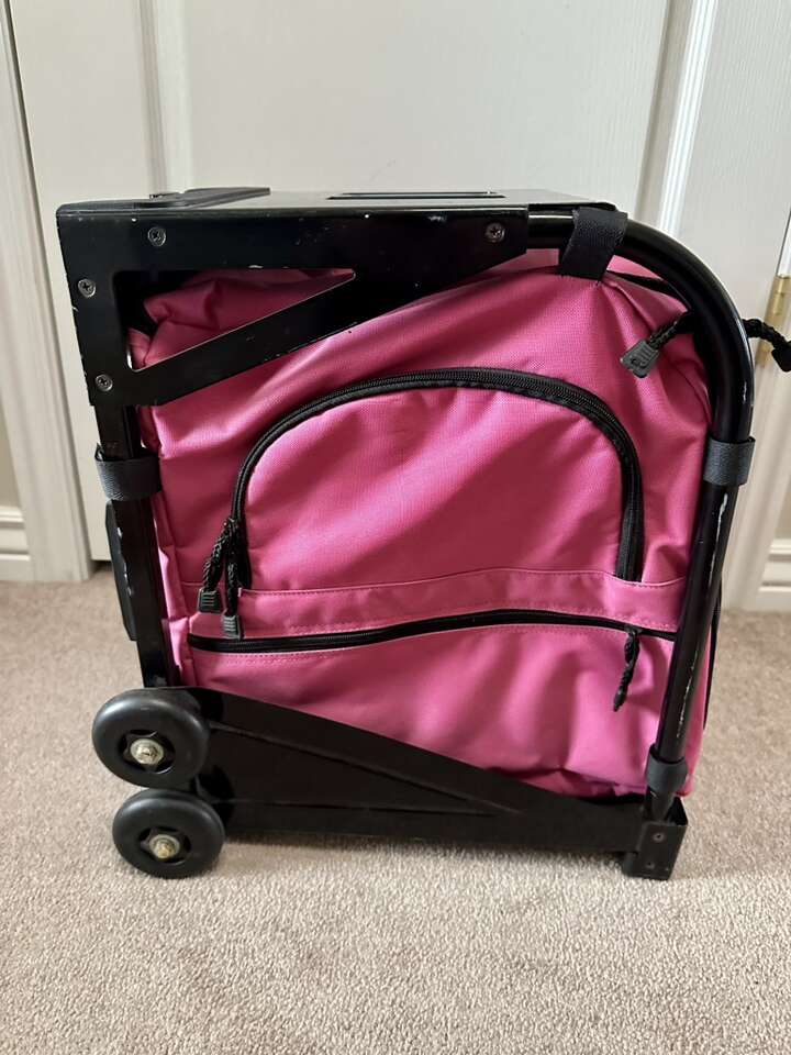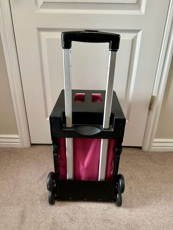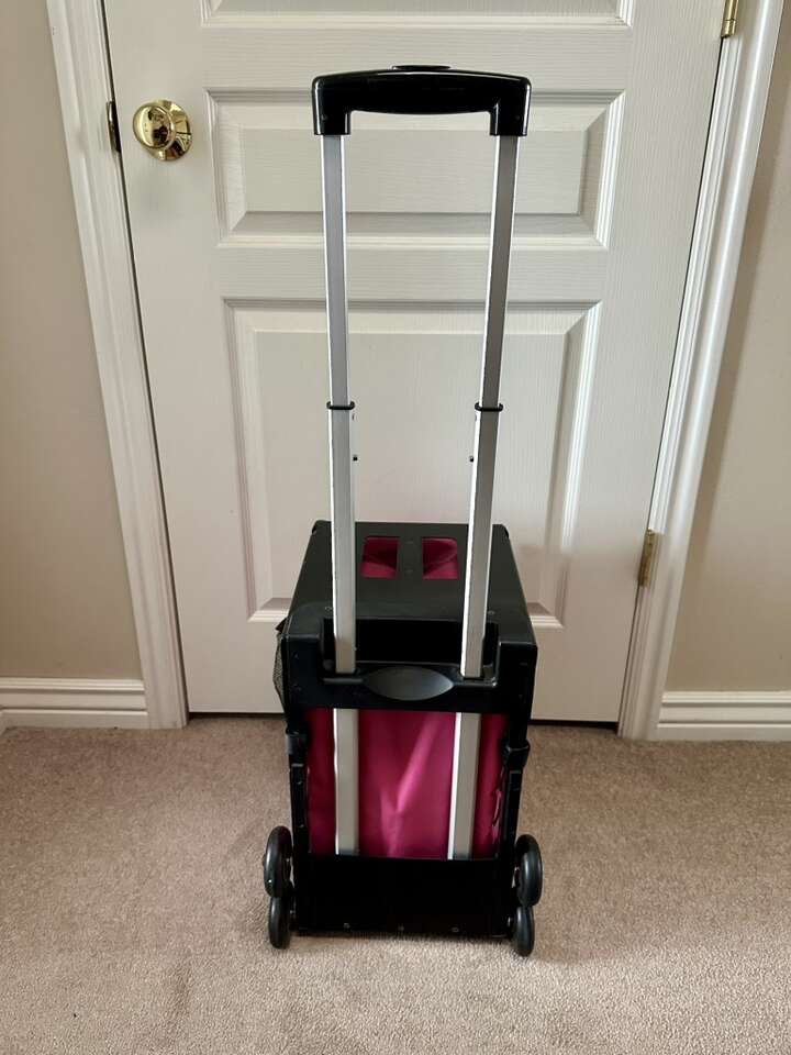Measures about 18”H 13”W 17”D. Like new condition. Wheels, handle and zippers work great. Comes with an accessory bag as shown in the picture. Great for light travel. Sales. Etc. Cute pink color! Lightweight solid frame to rest your booty on. $40.