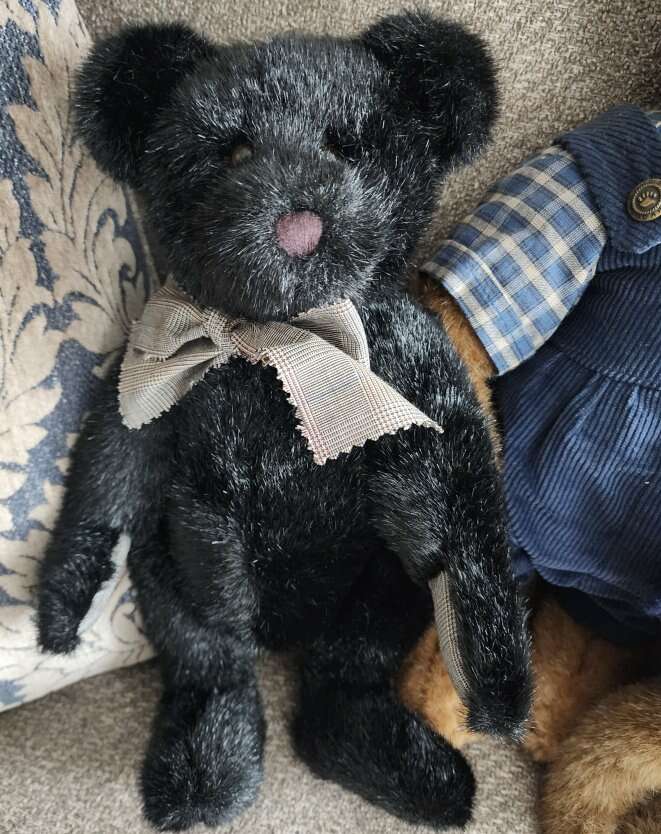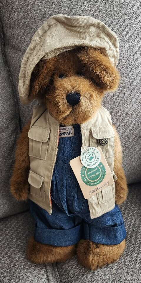 Three bears, only one has hang tag. Range from 16" to 12". $5 each All in excellent condition. Bear in overalls is now sold.