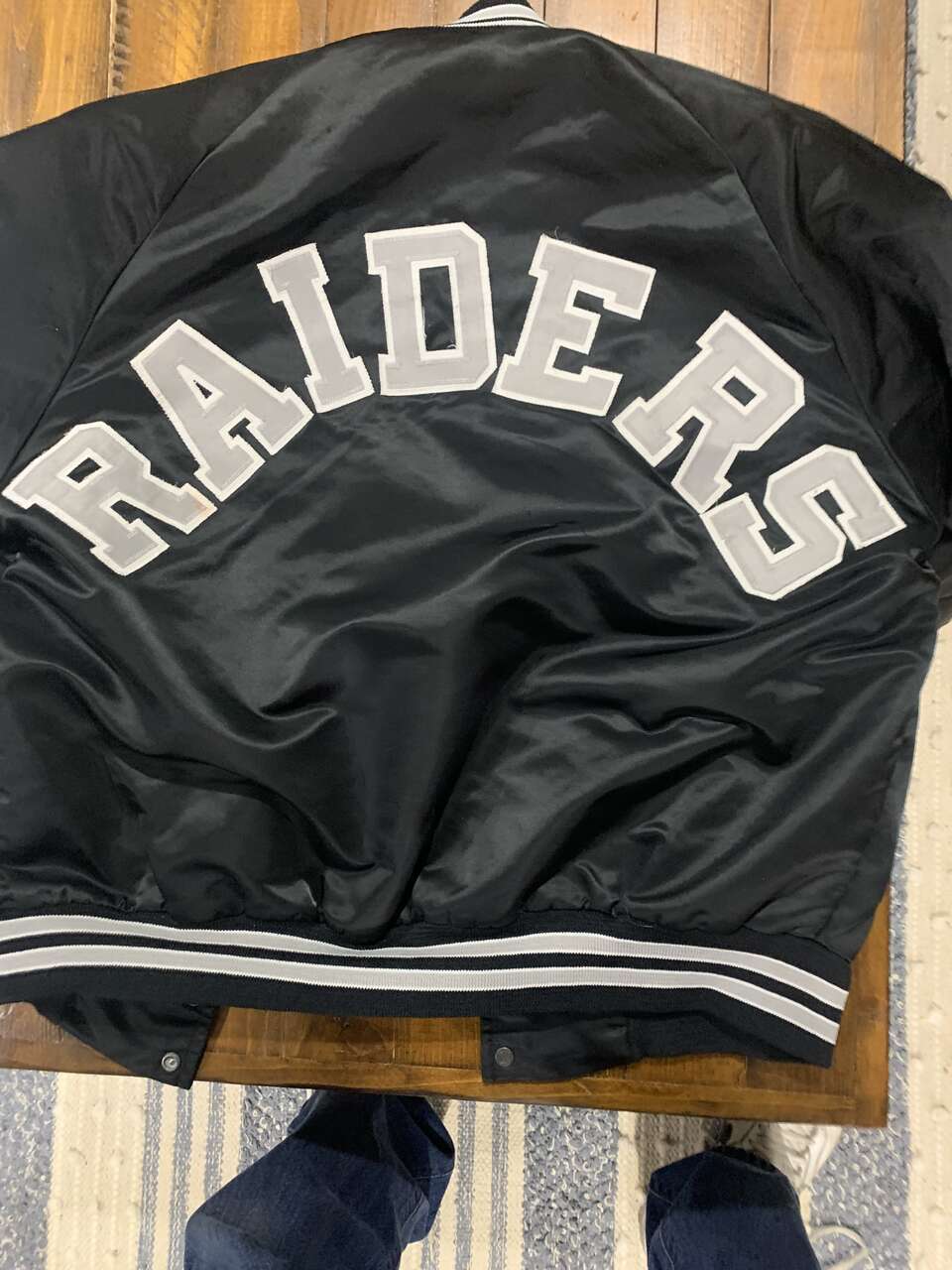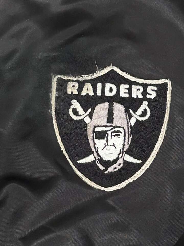 this jacket is a 80 s raider jacket. Madden, Stabler, Wells ,Biletnikoff. NOT a Las Angeles raider or a Las vegas raider jacket ORIGINAL!!! Size is a medium. Comes with a never used newer Raider hat