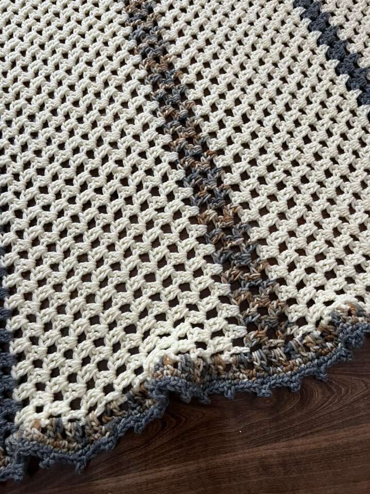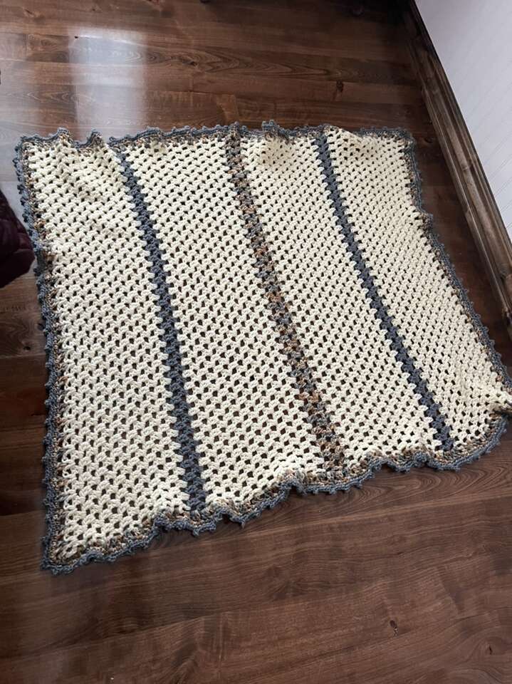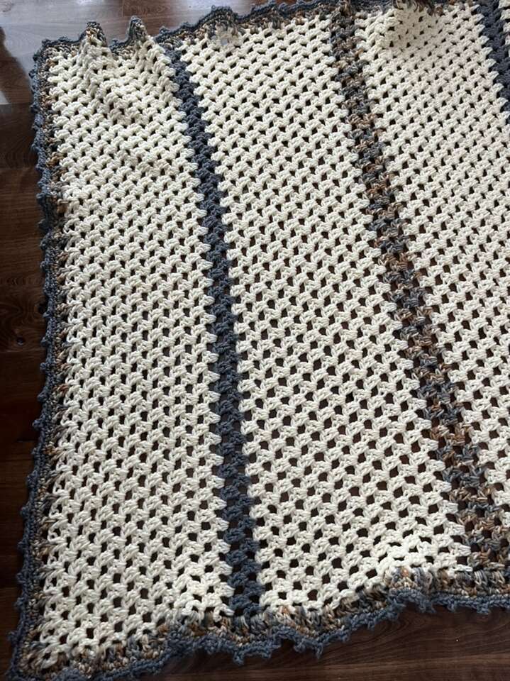 Handmade afghan 46 X 37 new! Cream/gray and tan